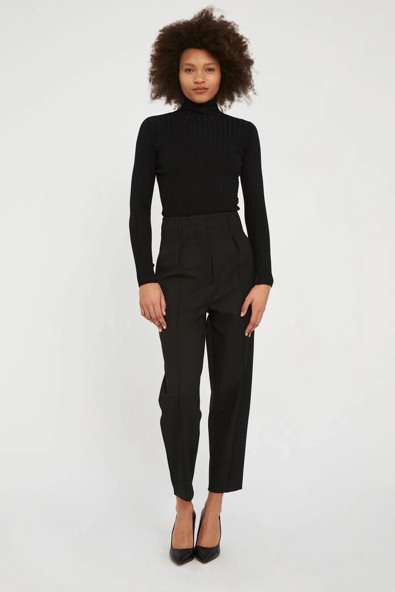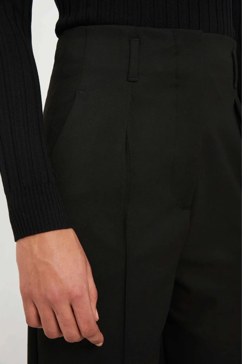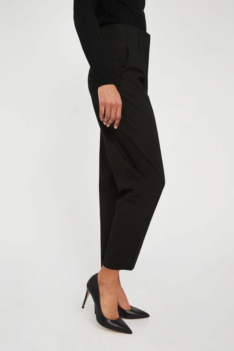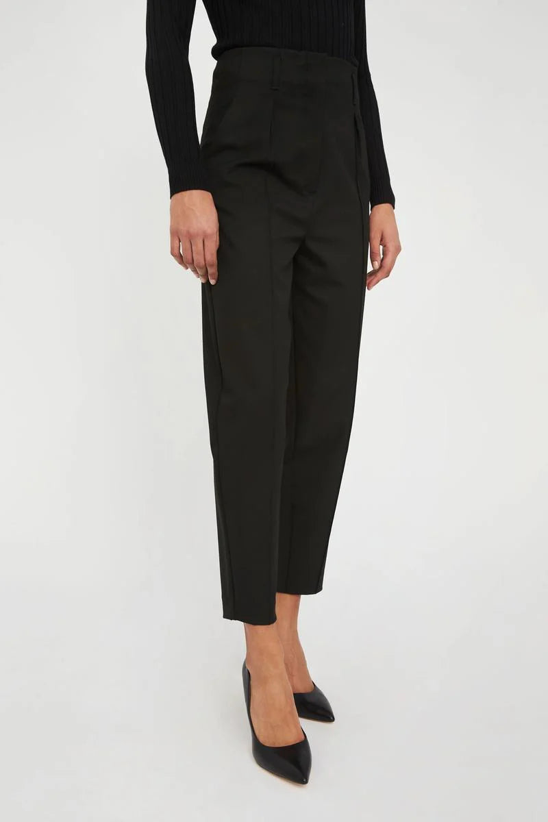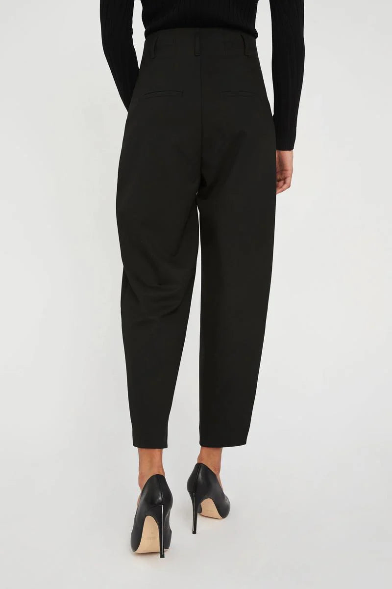 Hailey Black. Hailey fra Fiveunits er par sorte, elegante tapered-fit dressbukser, som er smalere ved anklene enn ved hoftene. Buksen er høy på livet og formet slik at de er løsere øverst og gradvis blir smalere nedover bena. Dette gir en flatterende passform som følger kroppens naturlige linjer uten å være helt stram. Linningen er formet i sømmene og har beltehemper plassert under den øverste kanten, slik at stoffet holder seg på plass under beltet. Også fin å bruke uten belte!