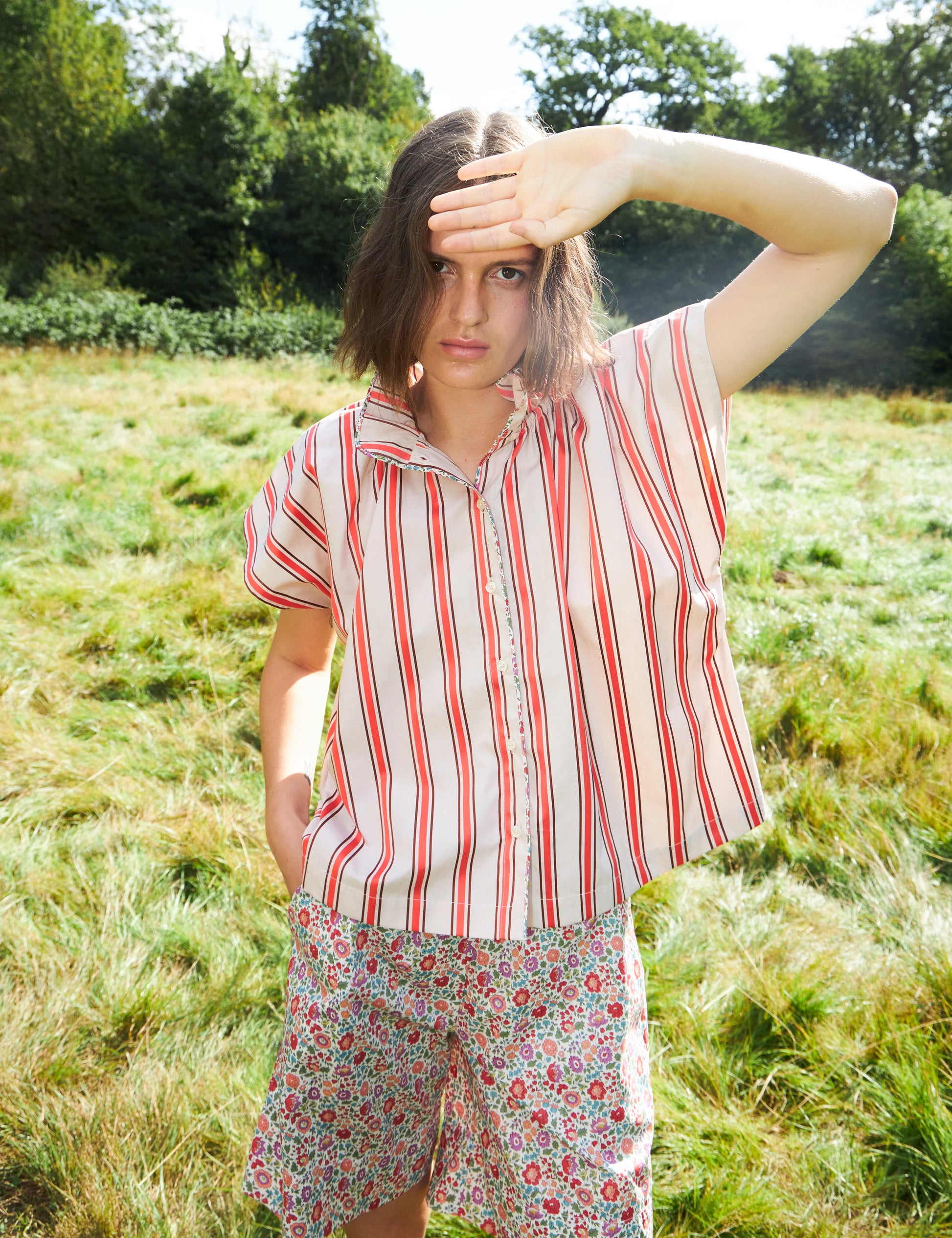 Ada Top Poppy Stripe. Ada-toppen fra APOF i det livlige rød- og beigestripede Poppy Stripe-printet kombinerer lekne mønstre med en feminin silhuett. Det lette bomullsstoffet gir god komfort, mens kantbånd i D’Anjo-print gir en raffinert kontrast langs kragen og knappelukkingen. Romslig i fasongen.
