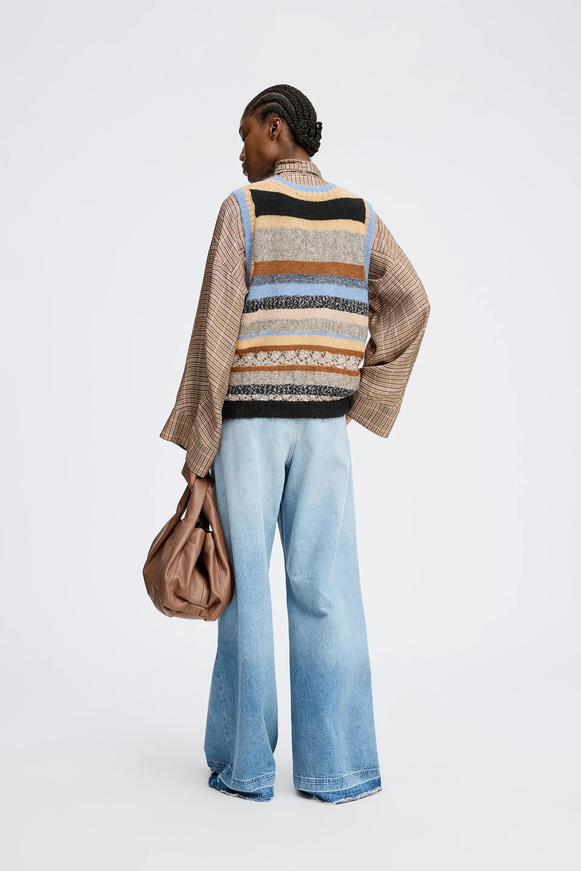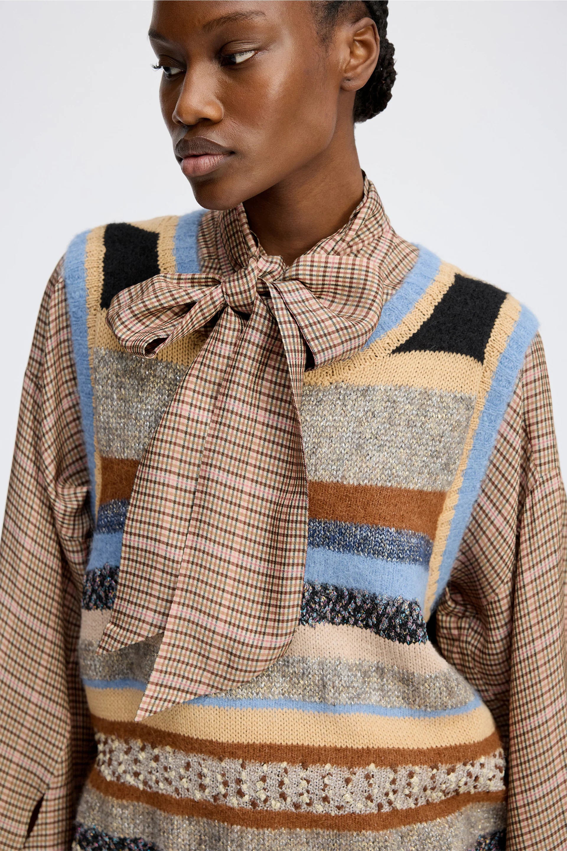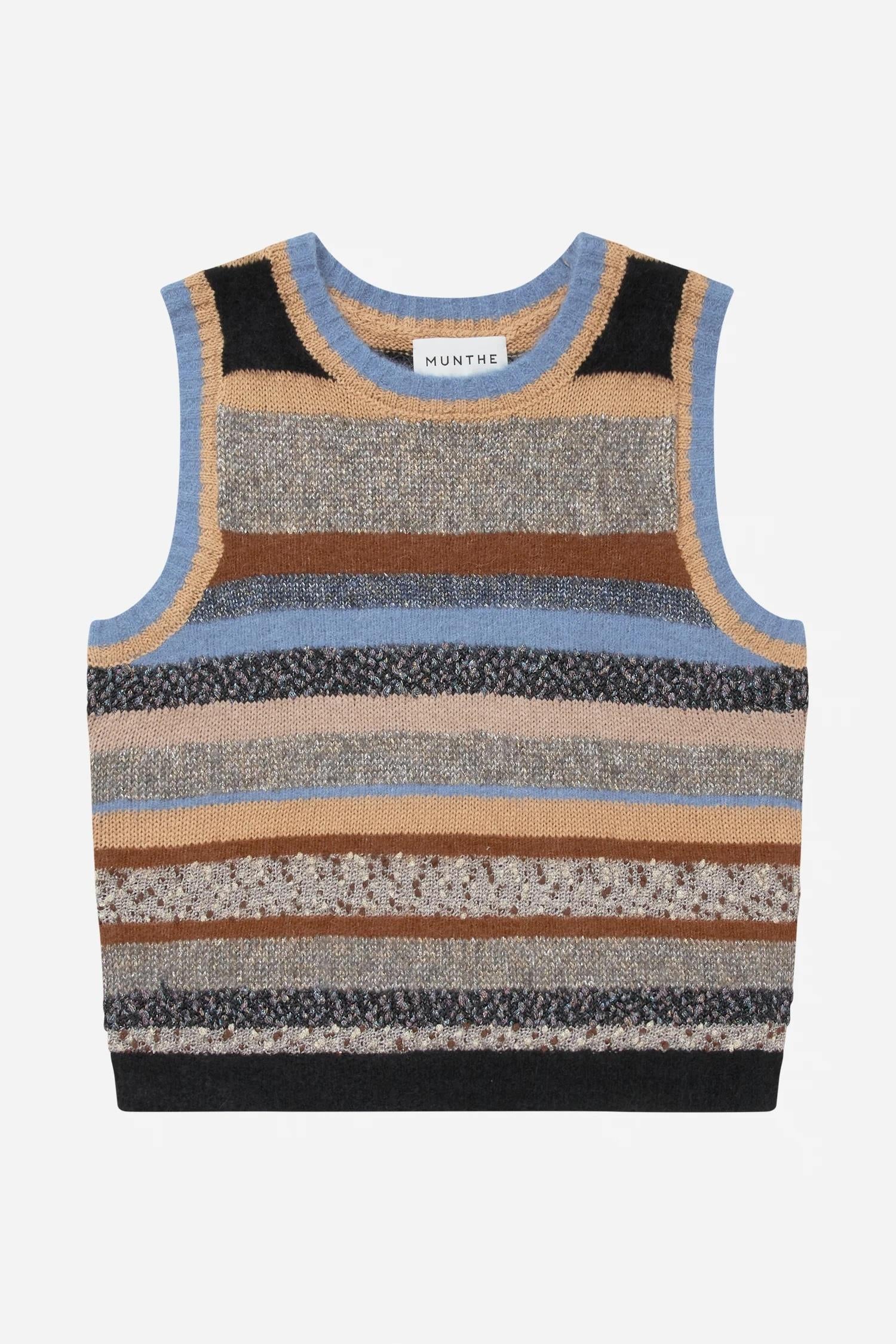 Lytti Vest Mix. Strikket vest fra Munthe med pene striper, vakkert kombinert av ulike typer garn. Vesten er designet med ribbedetaljer og rund hals.
