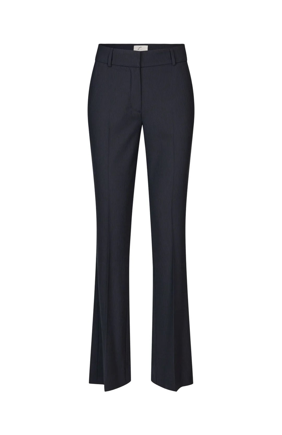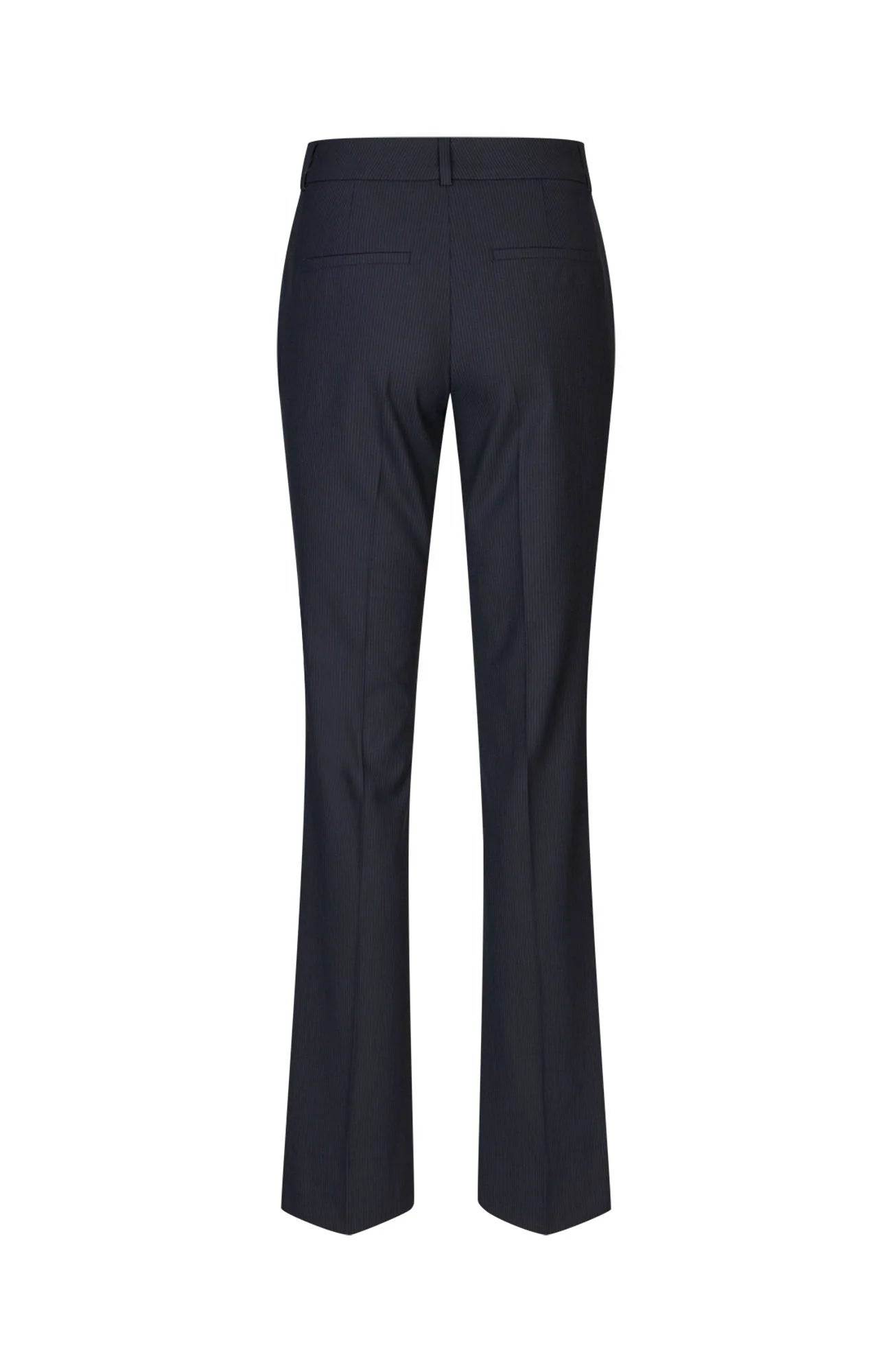 Clara Fv Navy Mini Pin. Mørkeblå dressbukser fra Fiveunits med lett utsvinget passform, nøye laget av et middels tungt stoff med nålestriper for et stilig og behagelig uttrykk. Med middels livhøyde sitter de på hoftene, former seg gjennom lårene og får en utsvingt silhuett fra knærne. Skarpe pressfolder fremhever det skreddersydde uttrykket, mens den allsidige fasongen gjør dem perfekte for mange ulike stylingmuligheter.