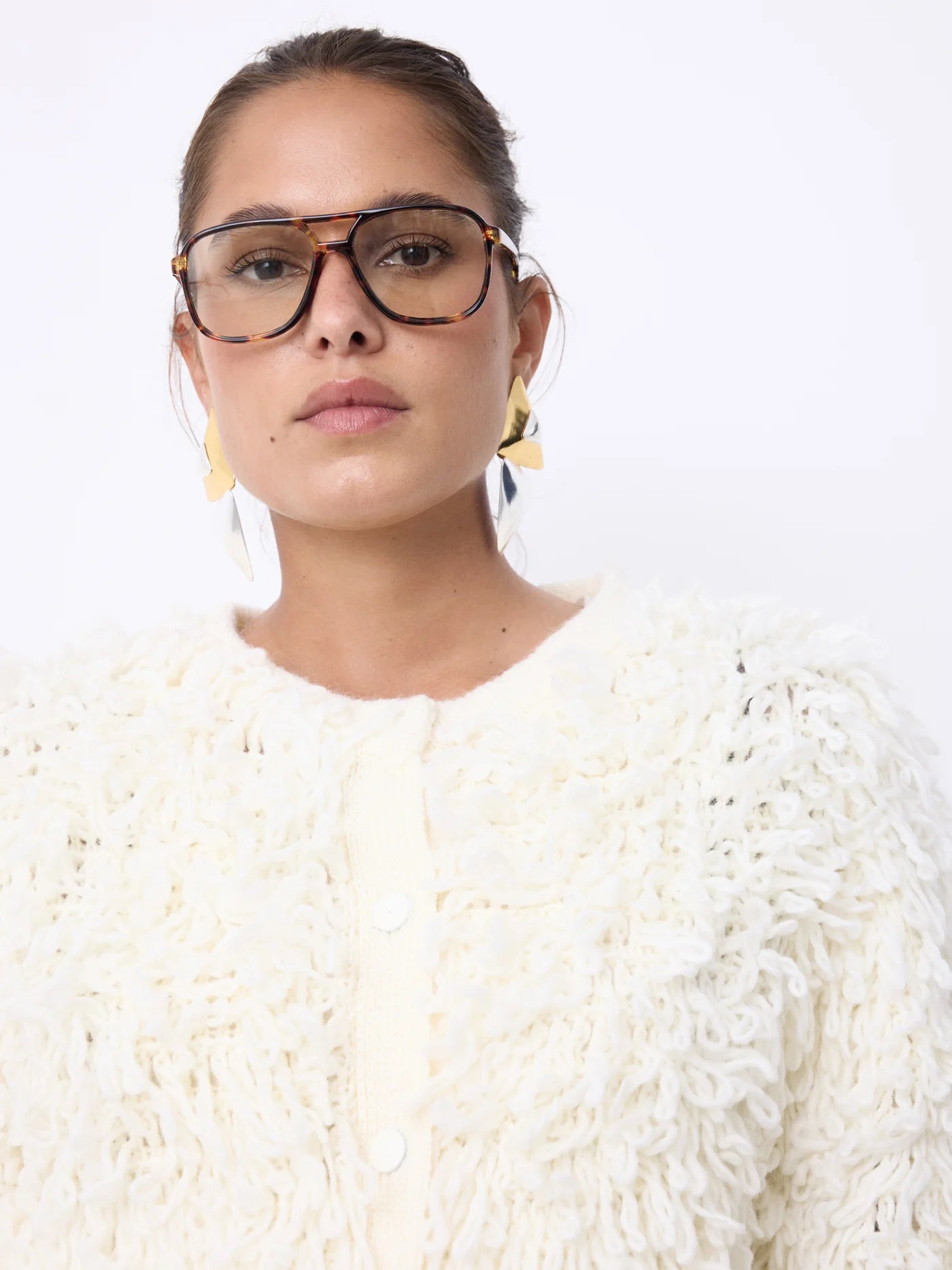 Clement Jacket Ecru. En helt rå, kremfarget cardigan fra Notshy. Jakken har rund hals, hvite trykknapper, avslappet passform og tråder over det hele. Et statementplagg!