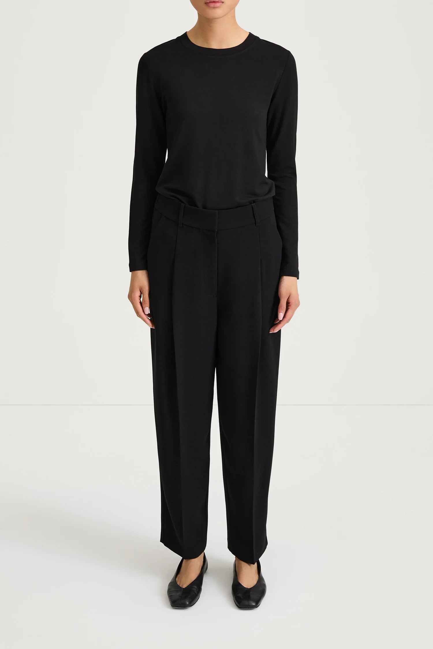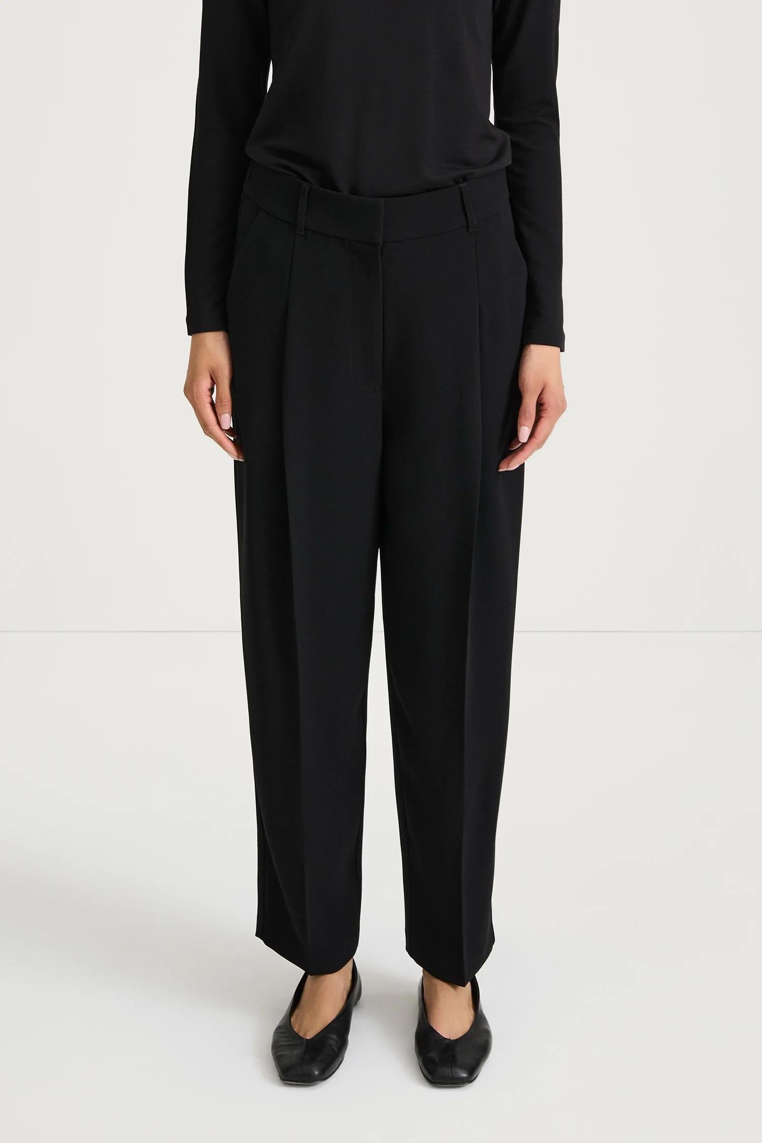 Berga Pant Black. Moderne dressbukser fra Styein, i luksuriøs crepe. Med sin lett vide passform og elegante, avrundede silhuett gir Berga et stilrent uttrykk. Den ankellange lengden gjør dem perfekte både til jobb og fritid. Den elastiske linningen bak sikrer komfort, mens skjulte knapper og skrå sidelommer foran gir et sofistikert preg.