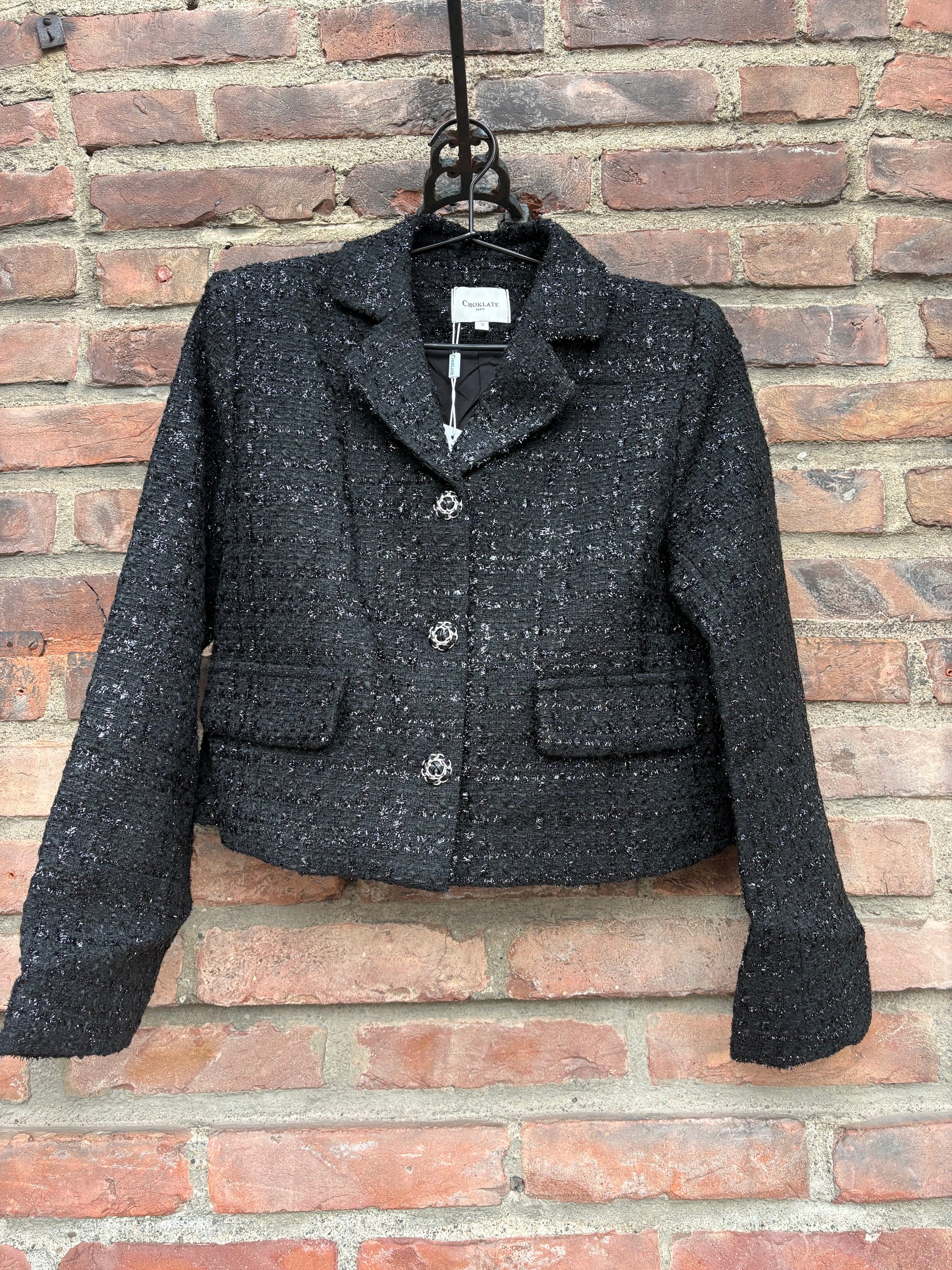 Short Tweed Blazer Black. Stilfull, sort boucléjakke som kombinerer klassisk eleganse med moderne snitt. Den korte jakken har en vakker blanding av matte og blanke stoffer, som gir et eksklusivt uttrykk. Stoffets grove tekstur tilfører dybde og karakter. Fronten prydes av dekorative metallknapper og to frontlommer.