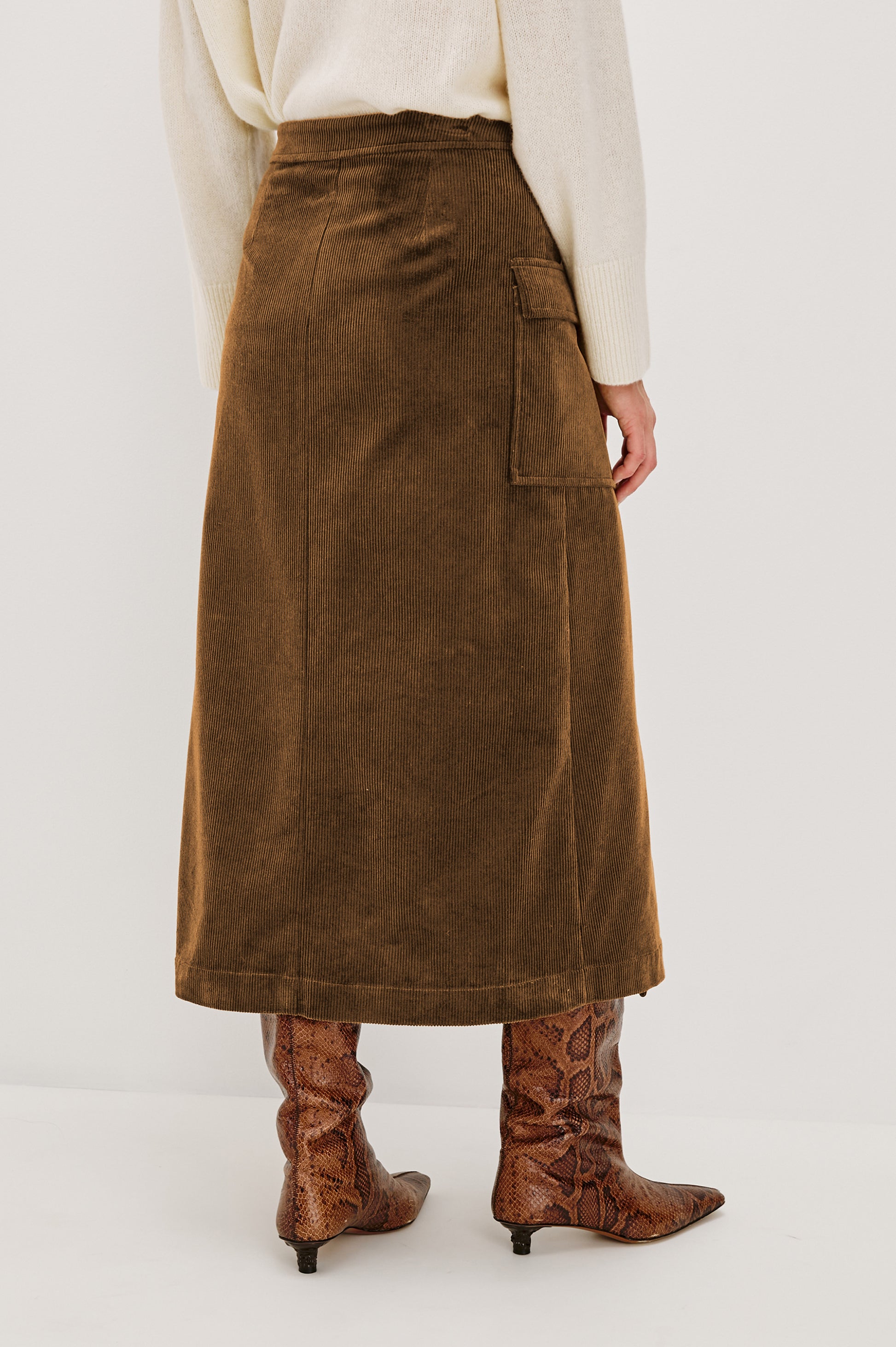 Graciela Skirt Chestnut. Brunt omslagsskjørt i kordfløyel fra Rails i midilengde. Skjørtet har en skreddersydd, rett silhuett og en praktisk hoftelomme. En justerbar ring i livet sørger for en perfekt og personlig passform.