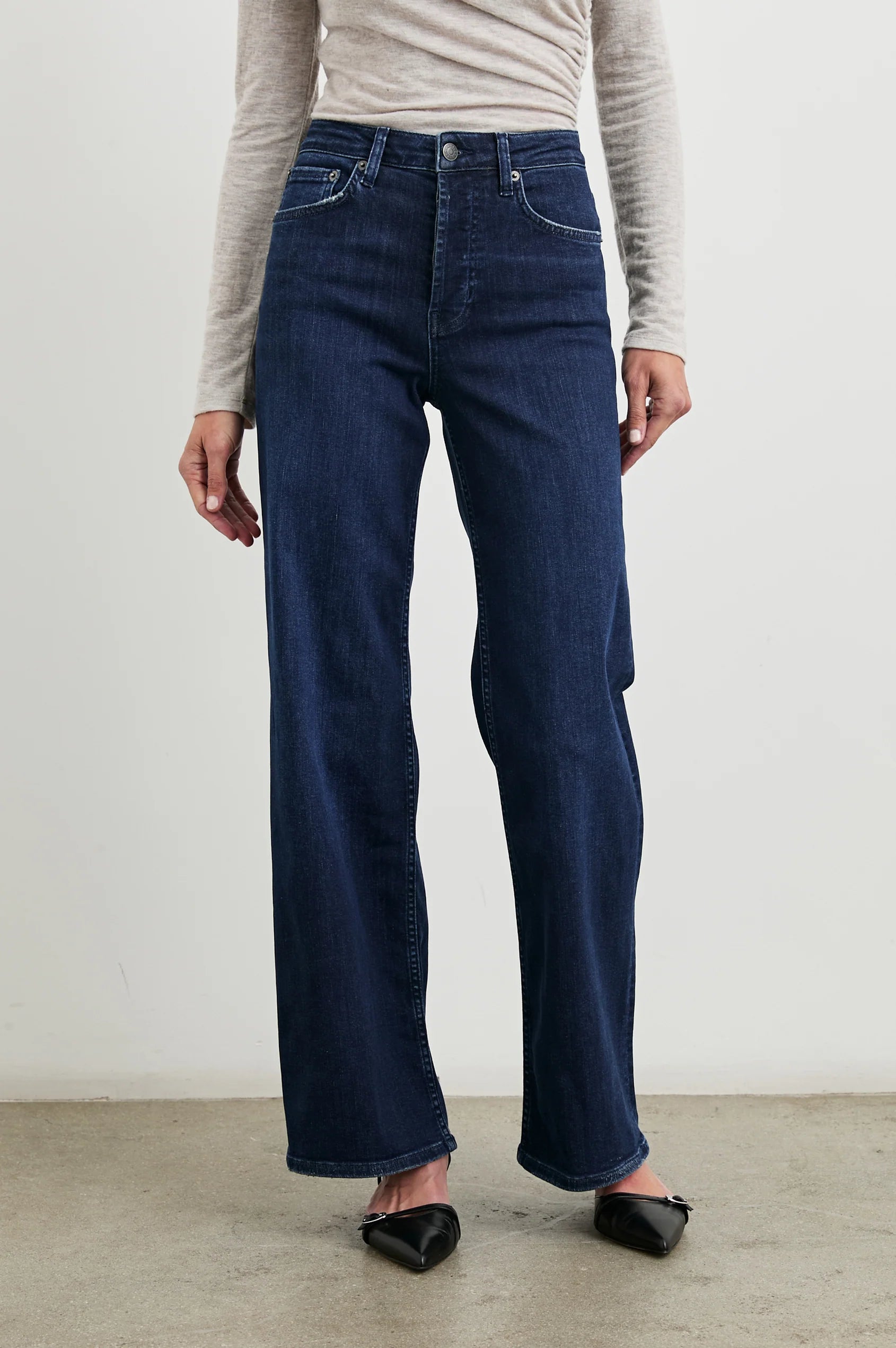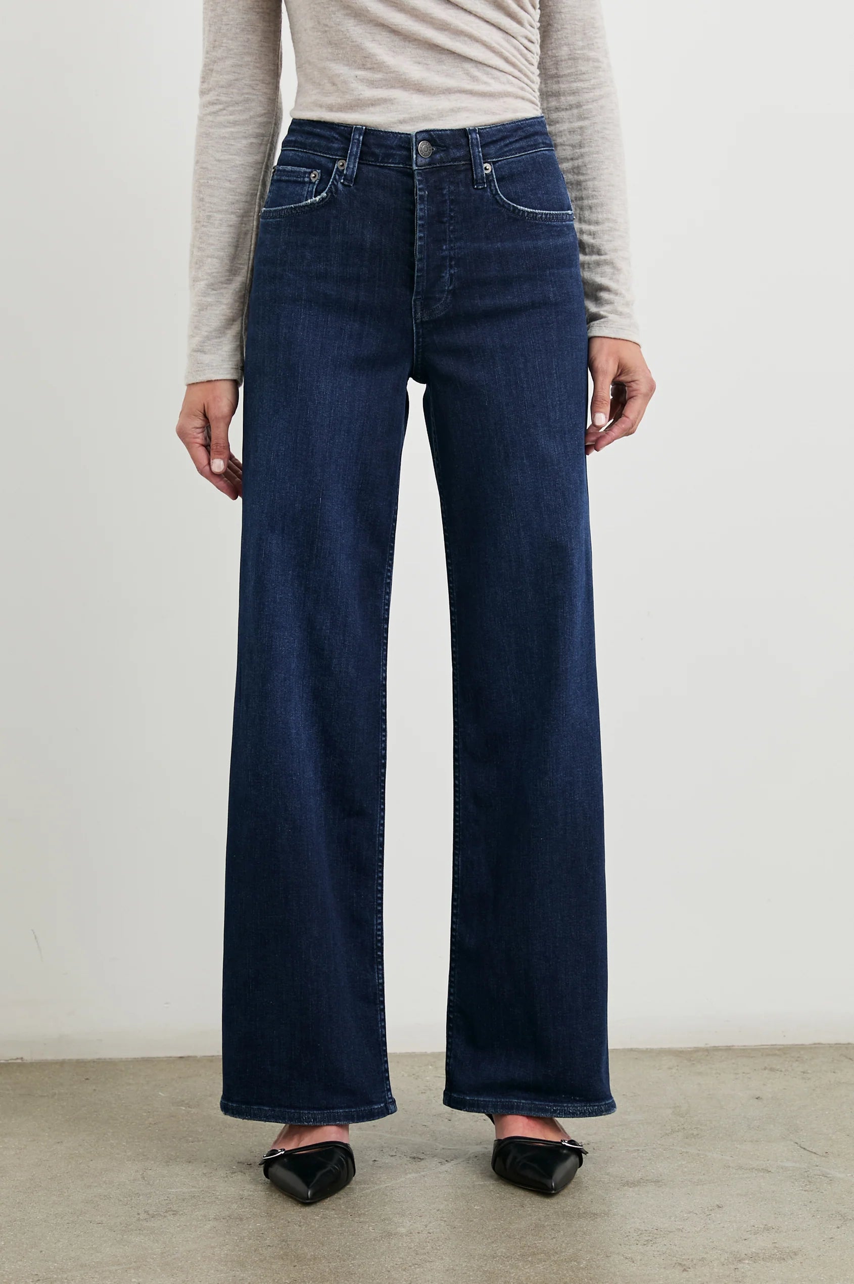 Getty After Midnight. Moderne tekstilinnovasjon møter klassisk design i Getty. Denne bestselgende jeansen fra Rails skaper en timeglass-silhuett med høyt liv, litt innsvinget midje og vide ben. Knappelukking i gylfen og litt stretch for komfort. Superfin, mørk denimvask.
