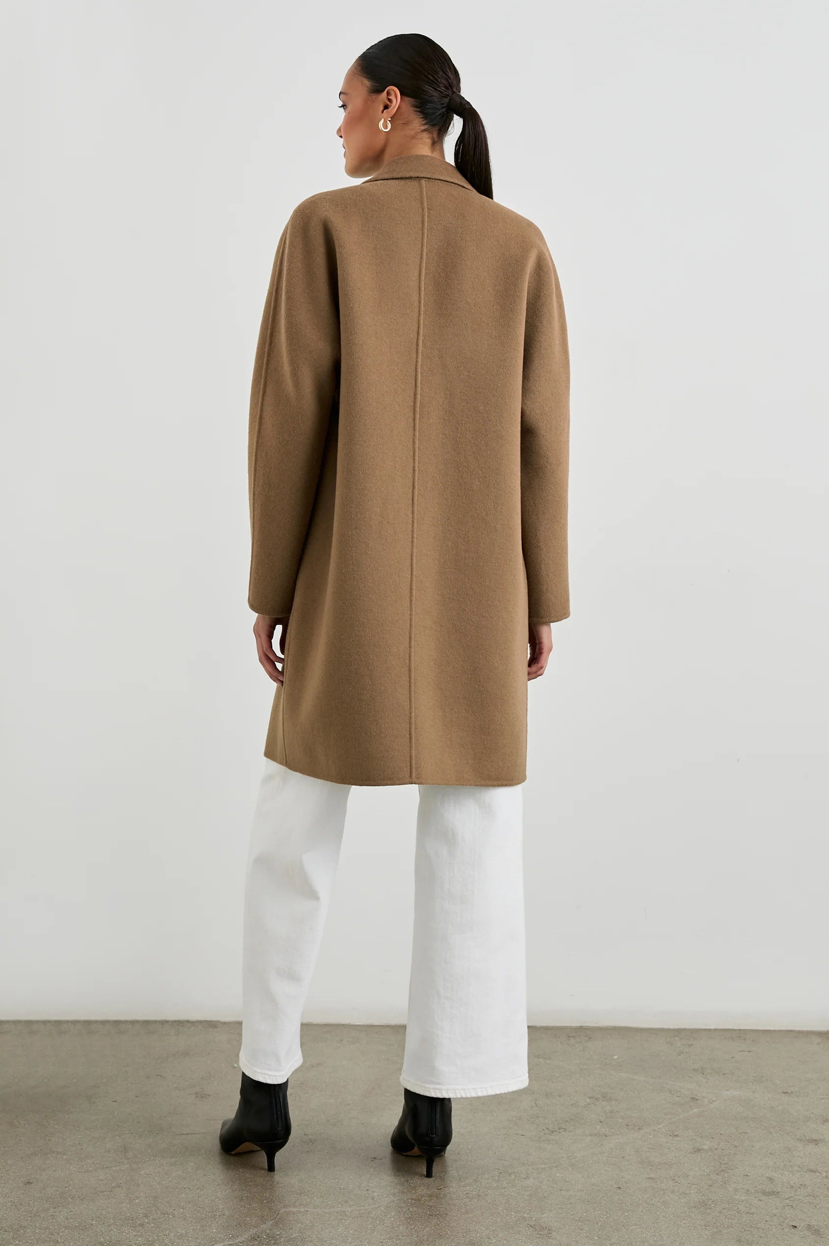 Everest Coat Camel. Luksuriøs kamelfarget kåpe fra Rails, det perfekte ytterplagget som løfter ethvert antrekk. Laget av en myk, litt lett ullblanding. Kåpen er uforet og har en lett oversized passform, spiss slagkrage, dolman-ermer, store påsydde lommer ved hoften og én-knapps lukking foran med hornknapp.