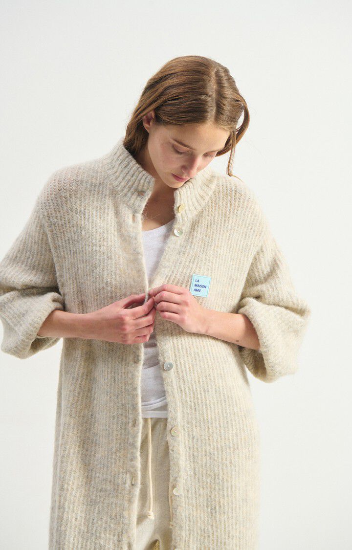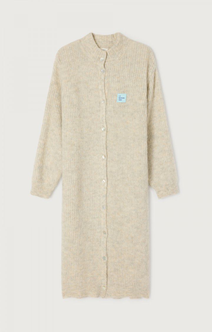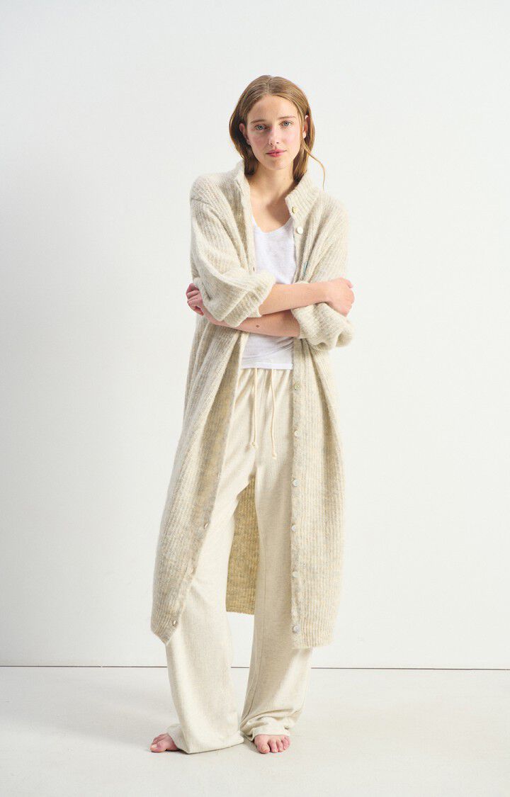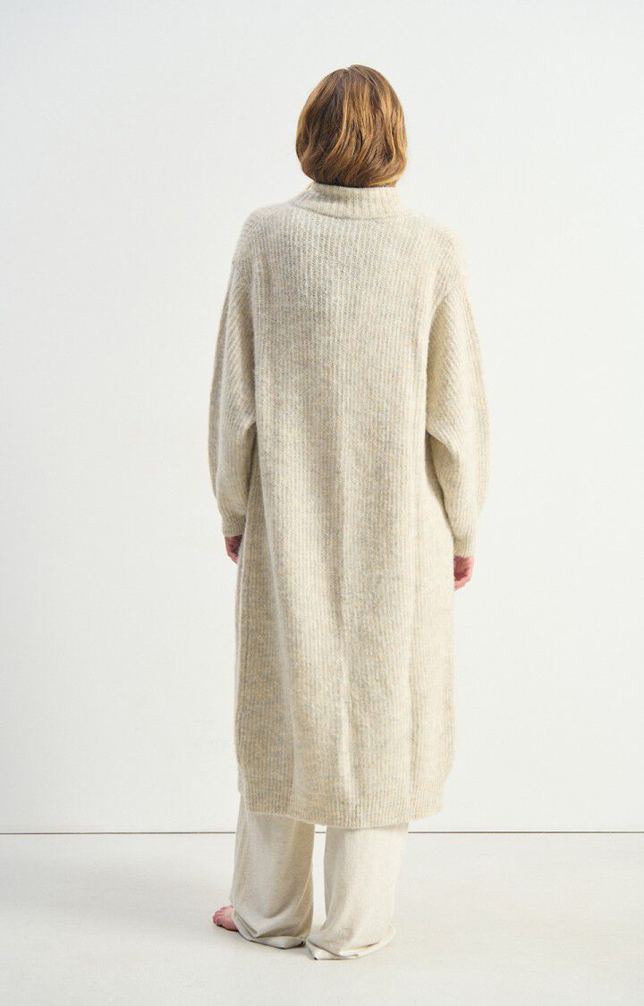 East Cardigan Long Powder Snow Melange. Lang strikkejakke fra American Vintage. Fargen er lys beige/kremfarget melert. Jakken har en liten blå logo på brystet. Diggeste plagget å pakke seg inn i denne sesongen!