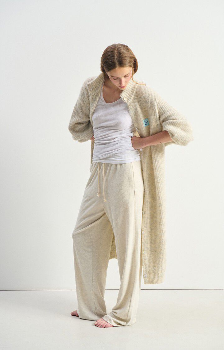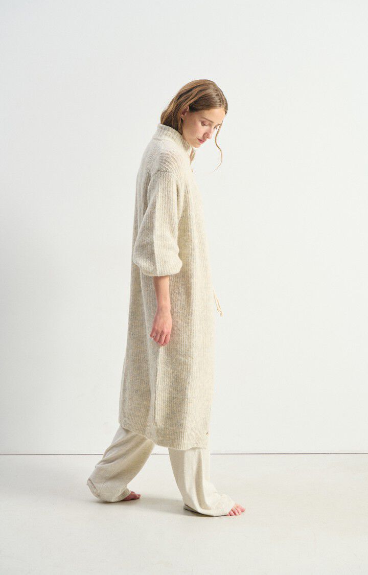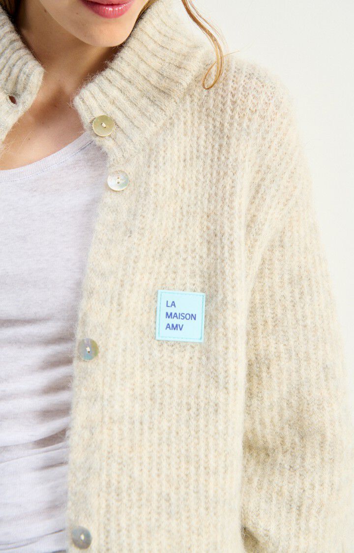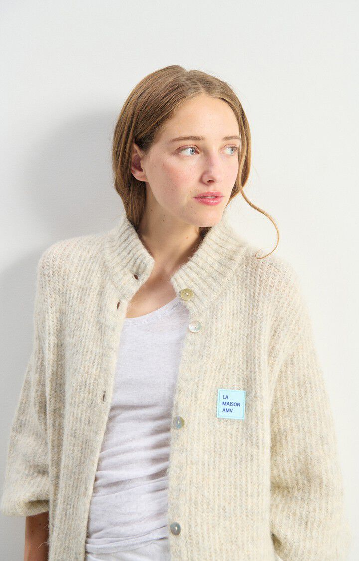 East Cardigan Long Powder Snow Melange. Lang strikkejakke fra American Vintage. Fargen er lys beige/kremfarget melert. Jakken har en liten blå logo på brystet. Diggeste plagget å pakke seg inn i denne sesongen!