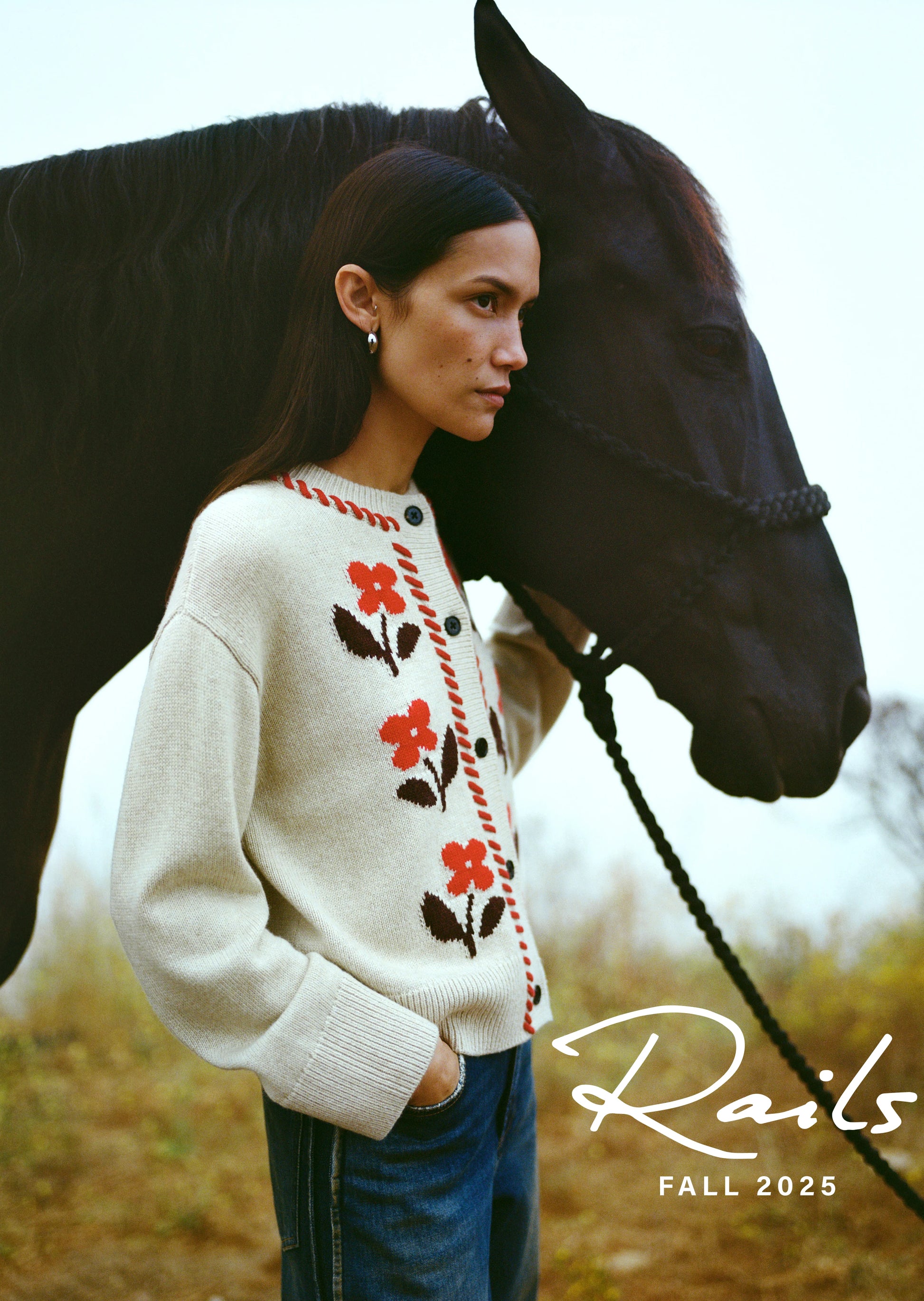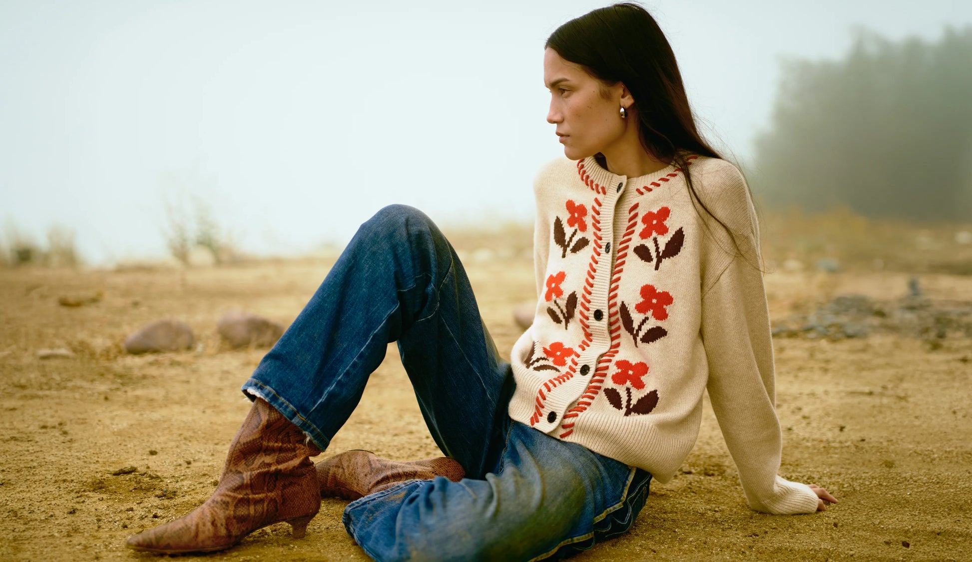Mavie Cardigan Carmine Floral. Beige cardigan fra Rails, inspirert av klassisk heritage-design, og med en boxy, croppet passform. Dekorative teppesting og røde jacquardblomster gir plagget et nostalgisk preg. Myk og deilig!