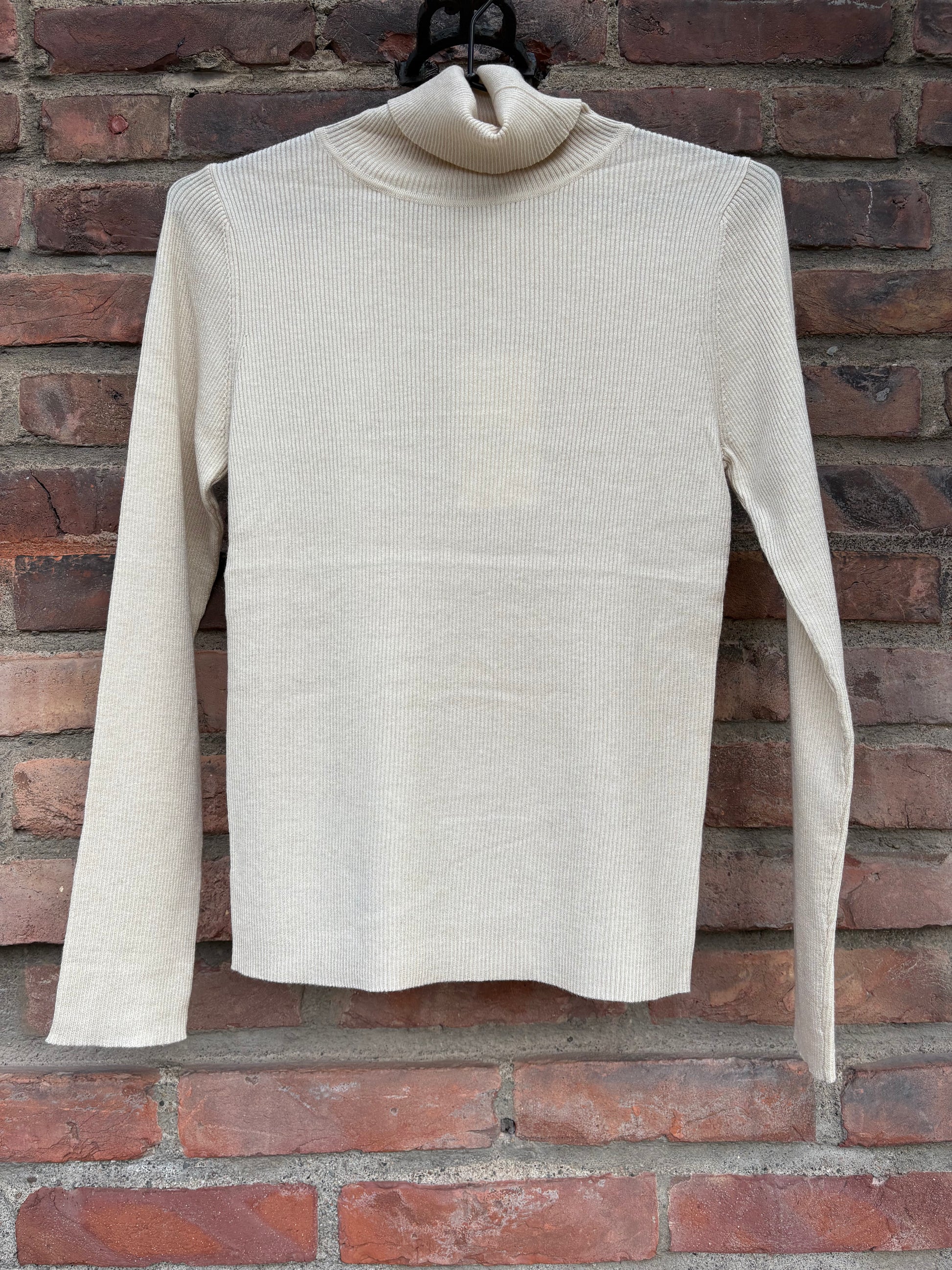 Polo Lurex Creme. Elegant, kremfarget høyhalset genser med lurextråder i gull. Ribbestrikket kvalitet med masse stretch. Finå bruke under jakker, eller alene til bukser og skjørt. Perfekt til party hvis du har en underdel som gjør mye ut av seg! Onesize. Genseren er håndplukket av Anne Kindem Agenturer i Paris, derav navnet From Paris with Love. Kommer i flere farger!