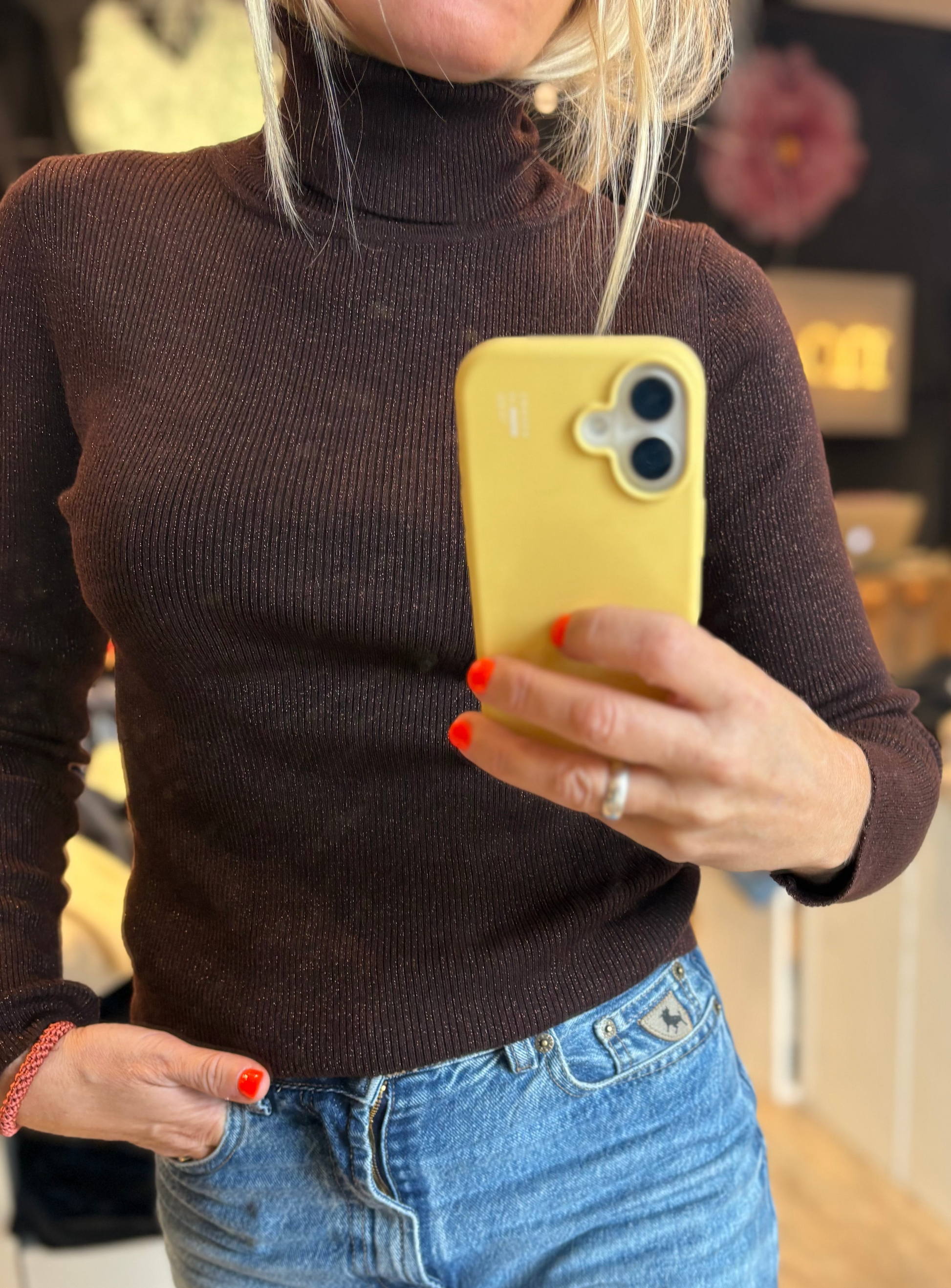 Polo Lurex Brown. Elegant høyhalset genser i brunt med lurextråder ton i ton. Ribbestrikket kvalitet med masse stretch. Finå bruke under jakker, eller alene til bukser og skjørt. Perfekt til party hvis du har en underdel som gjør mye ut av seg! Onesize. Genseren er håndplukket av Anne Kindem Agenturer i Paris, derav navnet From Paris with Love. Kommer i flere farger!