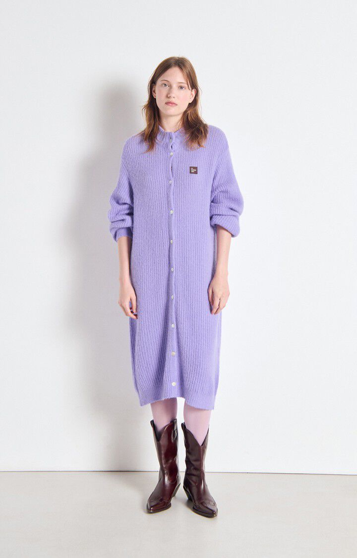 East Cardigan Long Lavender Pastel Chine. Lang, syrinfarget strikkejakke fra American Vintage. Jakken har en liten blå logo på brystet. Diggeste plagget å pakke seg inn i denne sesongen!