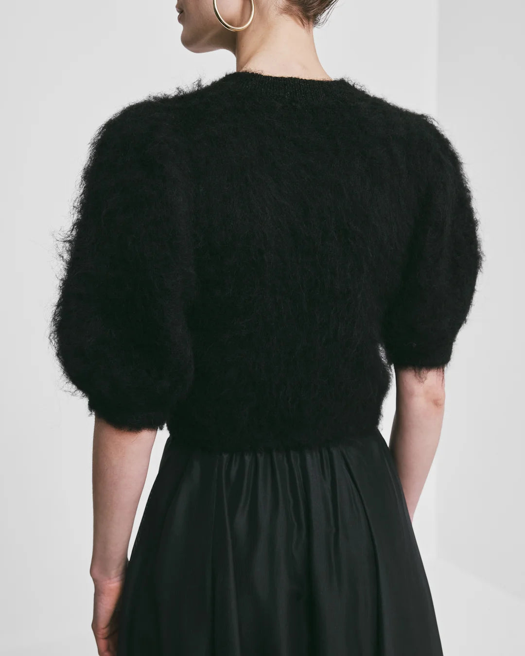 Hairy Knit Puffed Jacket Black. Sort, lodden cardigan fra byTimo i en deilig alpakkakvalitet. Jakken har en kort, ettersittende silhuett, korte puffede ermer med elastiske mansjetter og rund hals. Mansjettene, halsen og falden har vakre ribbestrikkede detaljer med lurex og små paljetter. Jakken lukkes foran med dekorative knapper. Perfekt til bukser og skjørt med høyt liv.