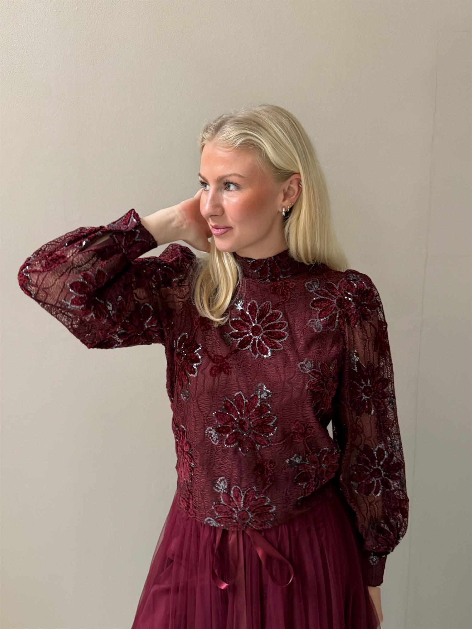 Lace Top Wine. Legg til et sofistikert preg på garderoben med denne vakre, vinrøde blusen med velour- og paljettdetaljer. Toppen har ballongarmer i transparent stoff fra skulder og ned. Halvhøy, rund hals og knepping bak. Plagget er kuratert av Anne Kindem Agenturer i Paris.