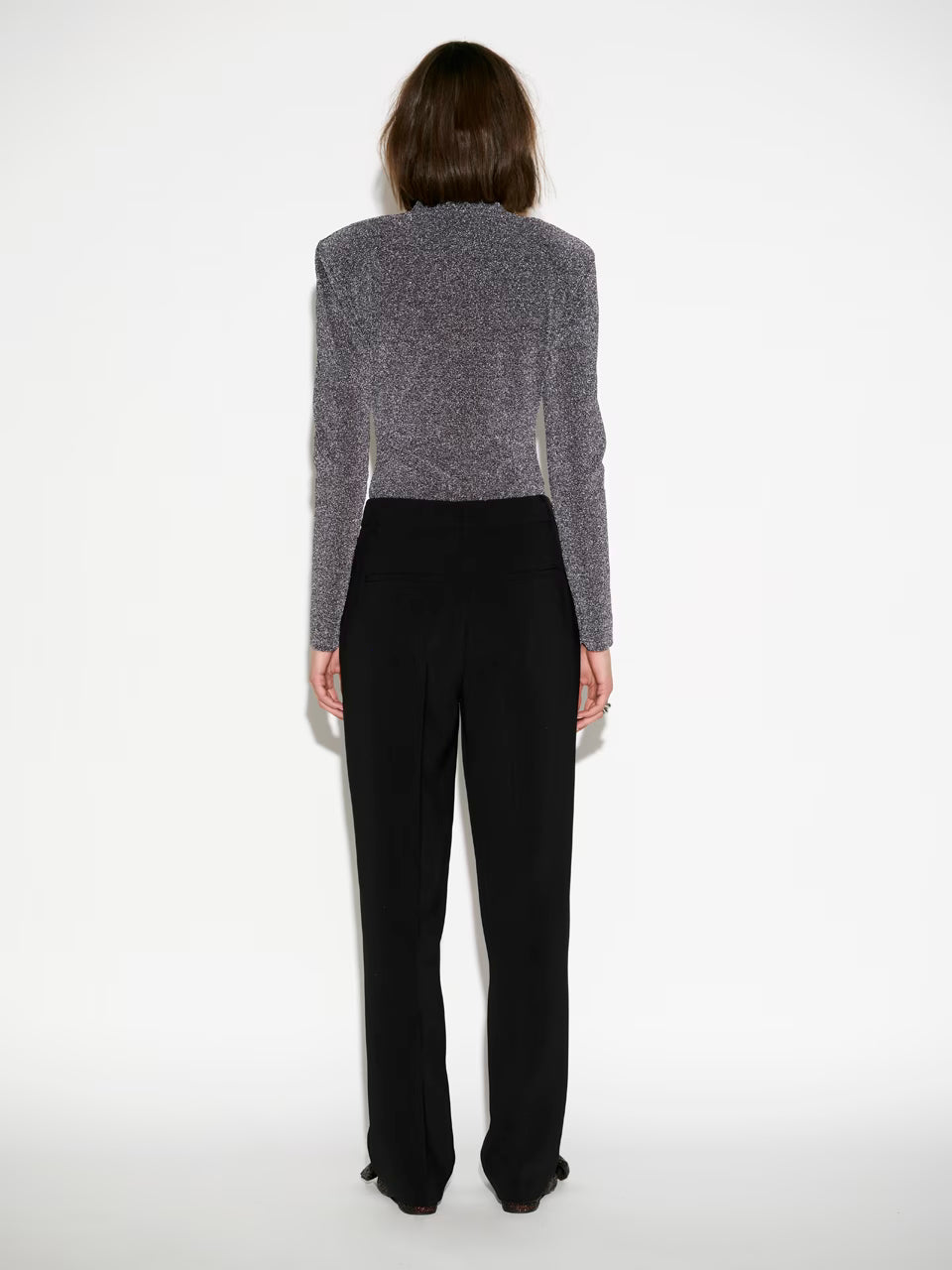Healey Lurex Bodytop Amethyst. Et blikkfang av en body fra Dante6. Laget i luksuriøs lurexjersey med en dyp V-hals og flatterende rynkedetaljer foran. Den har en subtil glans og en figurnær silhuett som kombinerer glam og komfort – perfekt til kveldsbruk.