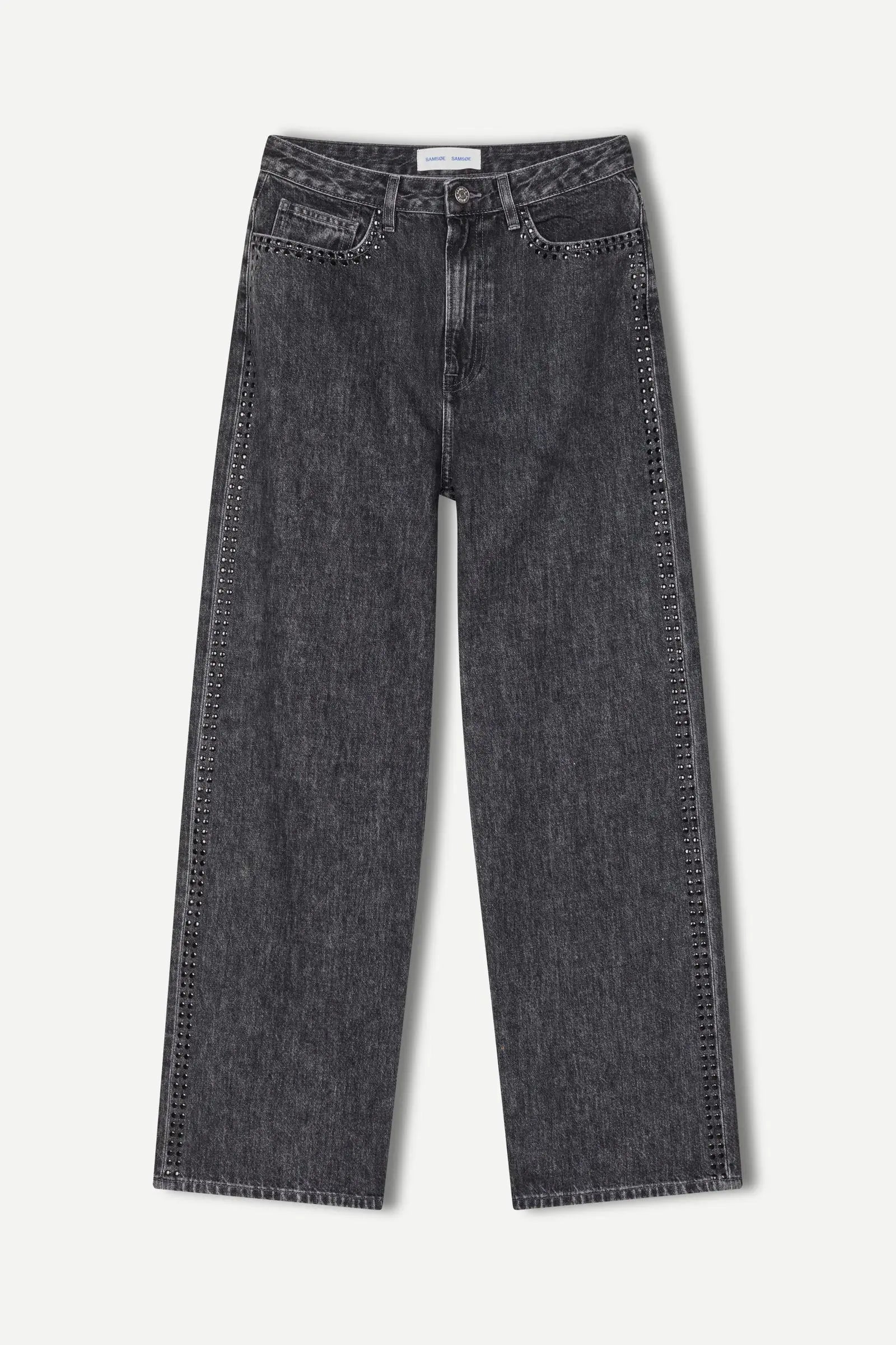 Sashelly Jeans Studs Grey Cloud. Low-waist jeans fra Samsøe Samsøe med løs passform og vide, rette ben, i en kul, grå denimvask. Klassisk femlommersdesign med beltehemper. Sorte studs langs sidesømmene gir et edgy uttrykk. Buksen skal henge på hoften og være loosefit, du kan gå en størrelse ned om du ønsker en litt smalere modell og ha den litt høyere opp i livet.