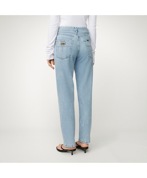 New Dana Diplomatico Bleach. Dad fit jeans fra Lois med løs passform. Medium høyde på livet. Superfin, lys blå jeansvask. Lengden er 32-lengde (croppet).