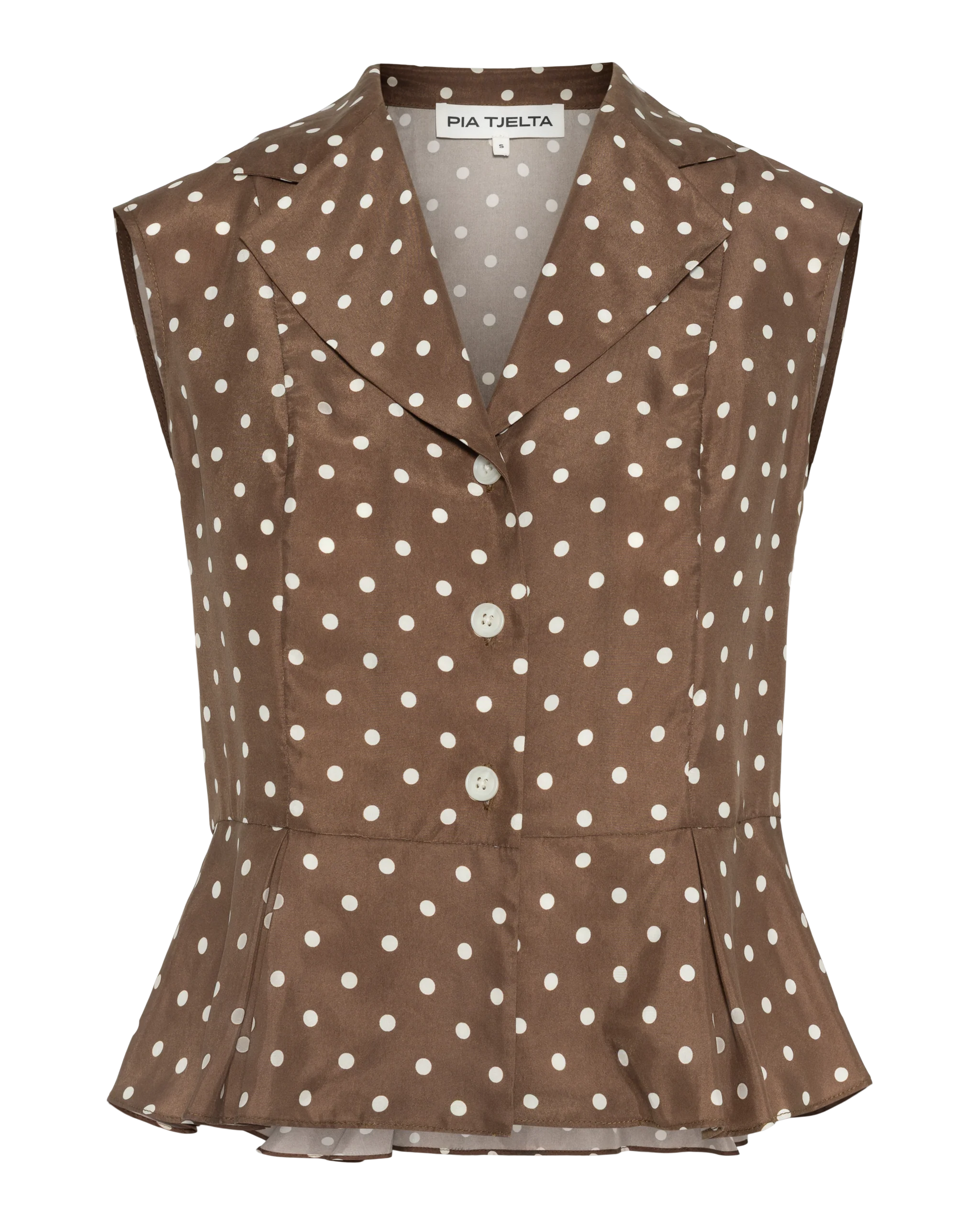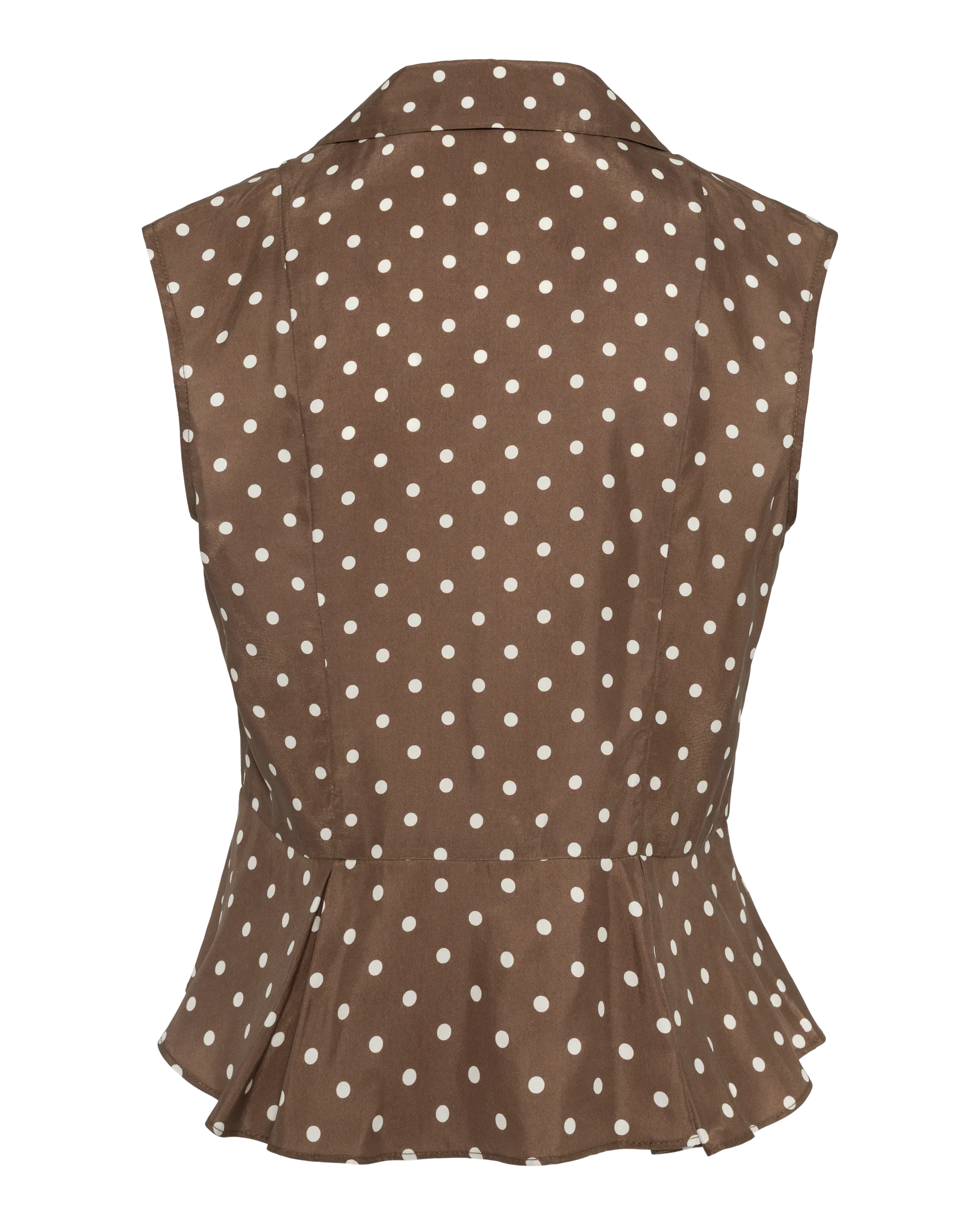 Melrose Bluse Dots Brown. En ermeløs bluse med prikker og et skreddersydd, nesten dressinspirert uttrykk, fra Pia Tjelta. Innsvinget i livet med en diskret vidde som gir en flatterende silhuett, avsluttet med hakket krage og knappelukking foran. Strukturert, men samtidig lett å ha på. Et plagg som holder fasongen og løfter hele antrekket.