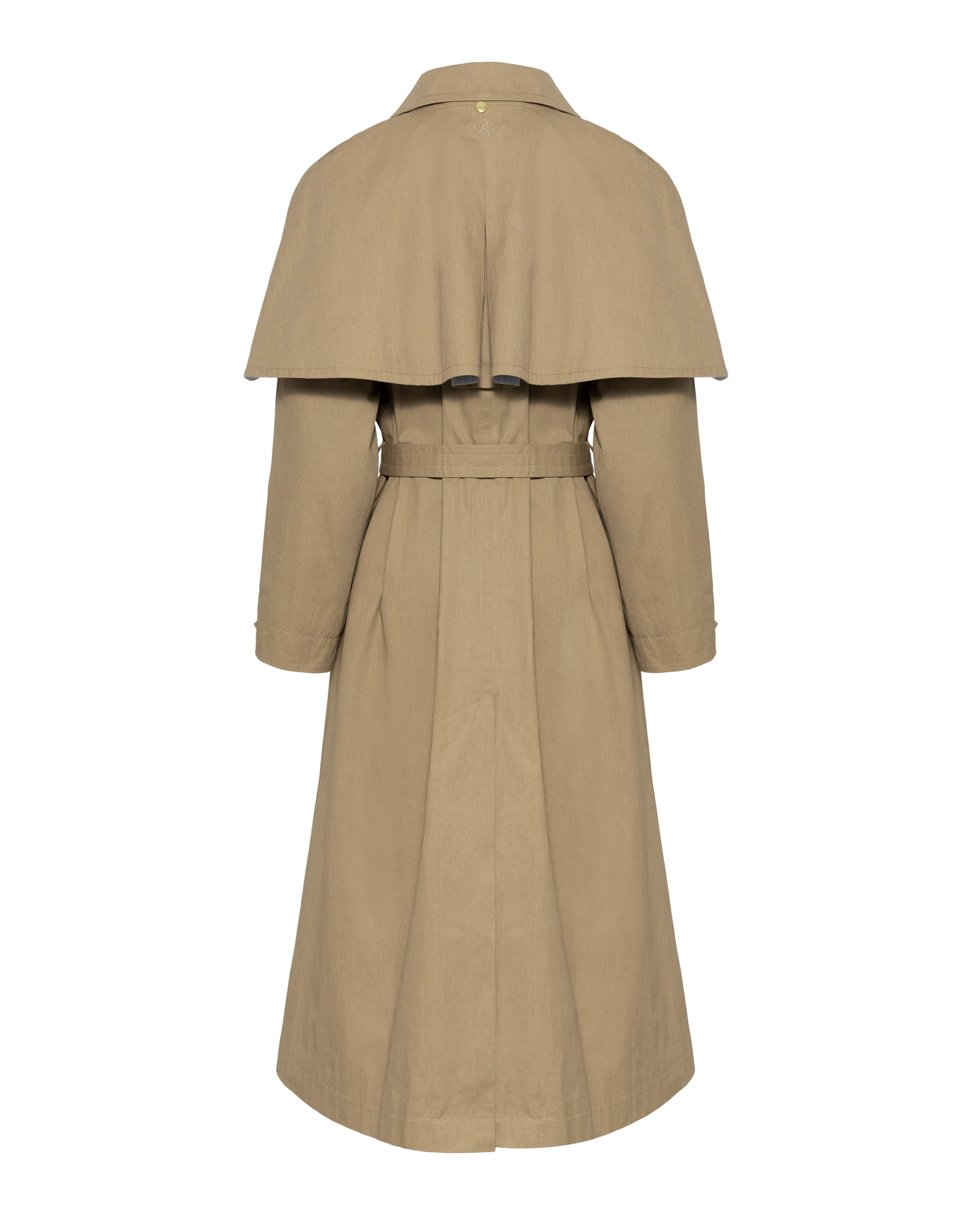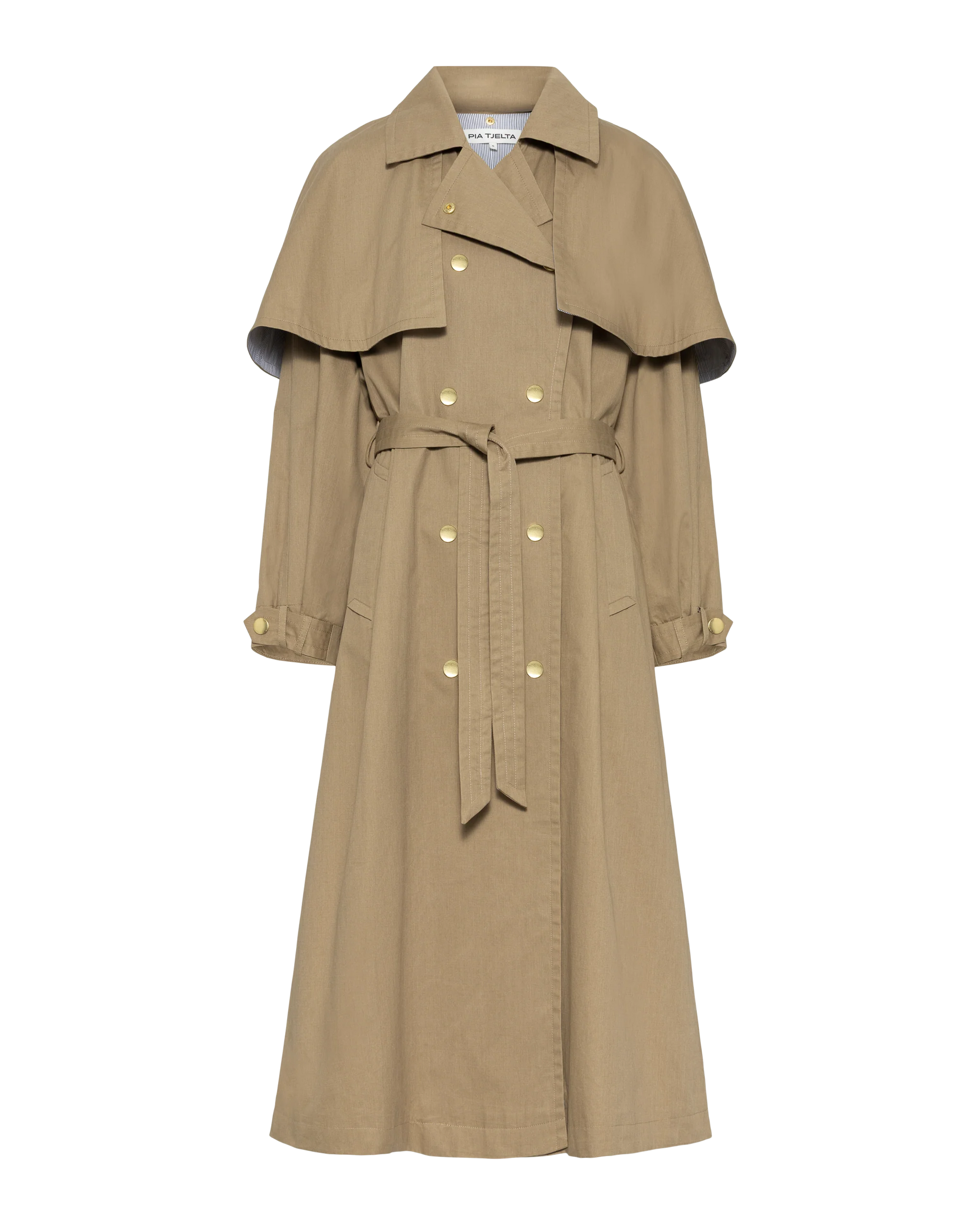 Monti Jacket Beige. En klassisk trench med en vri, fra Pia Tjelta. Skåret i strukturert bomull med en avslappet, feminin silhuett. Designet med dobbeltspent front, gullfargede knapper og belte som markerer midjen. Avsluttes med en avtakbar kappe-detalj som enkelt kan tilpasses etter humør og styling.