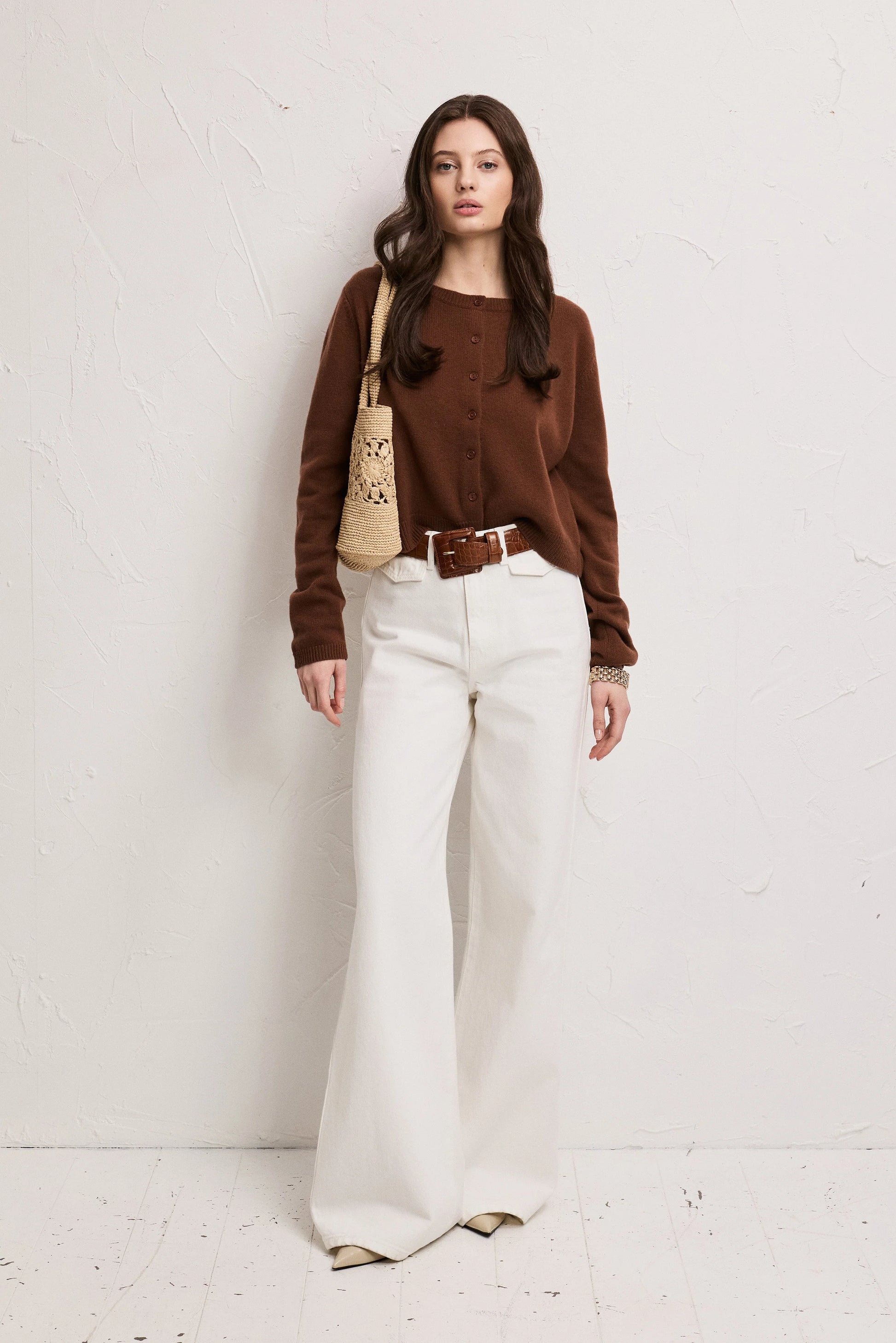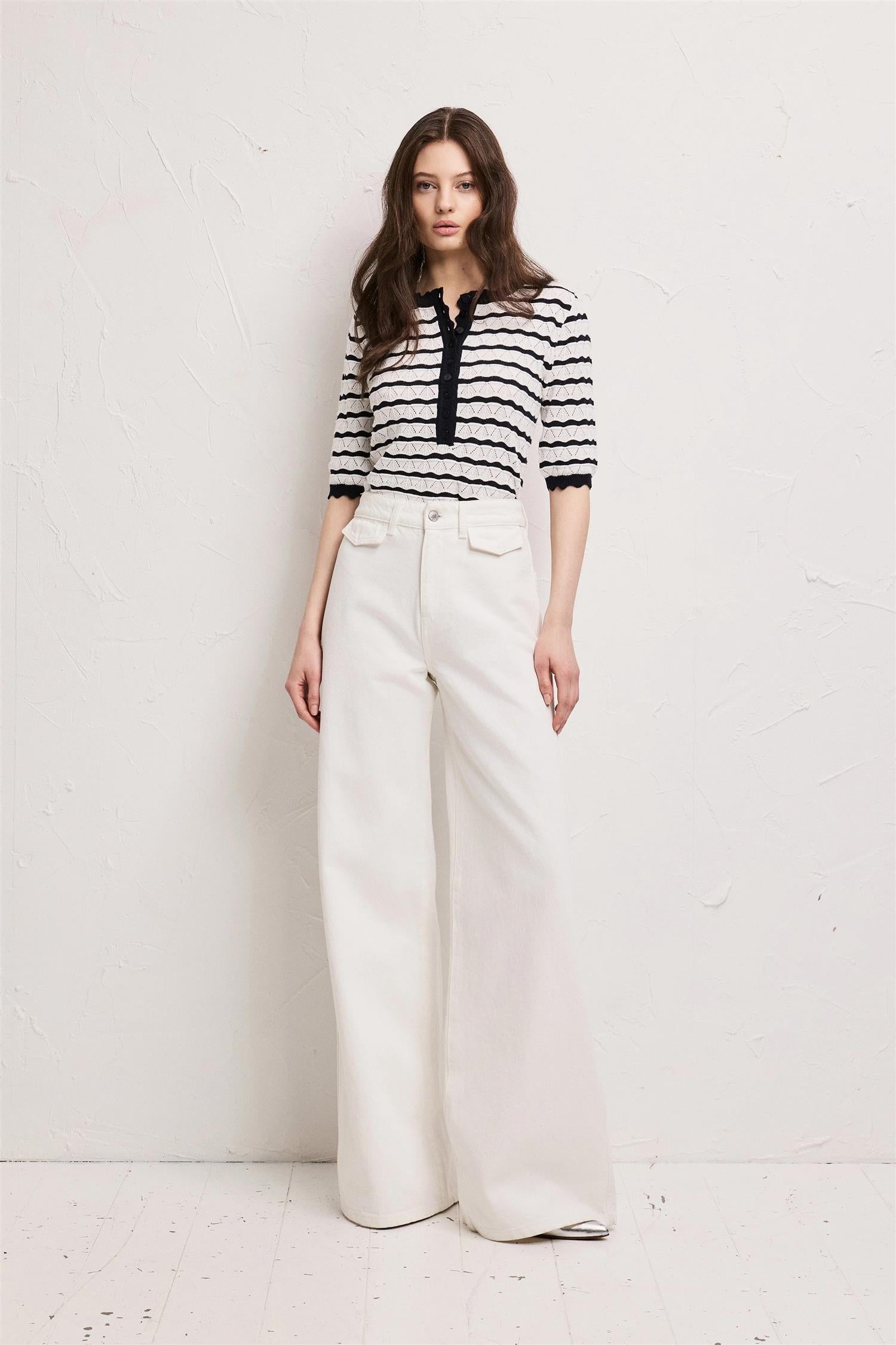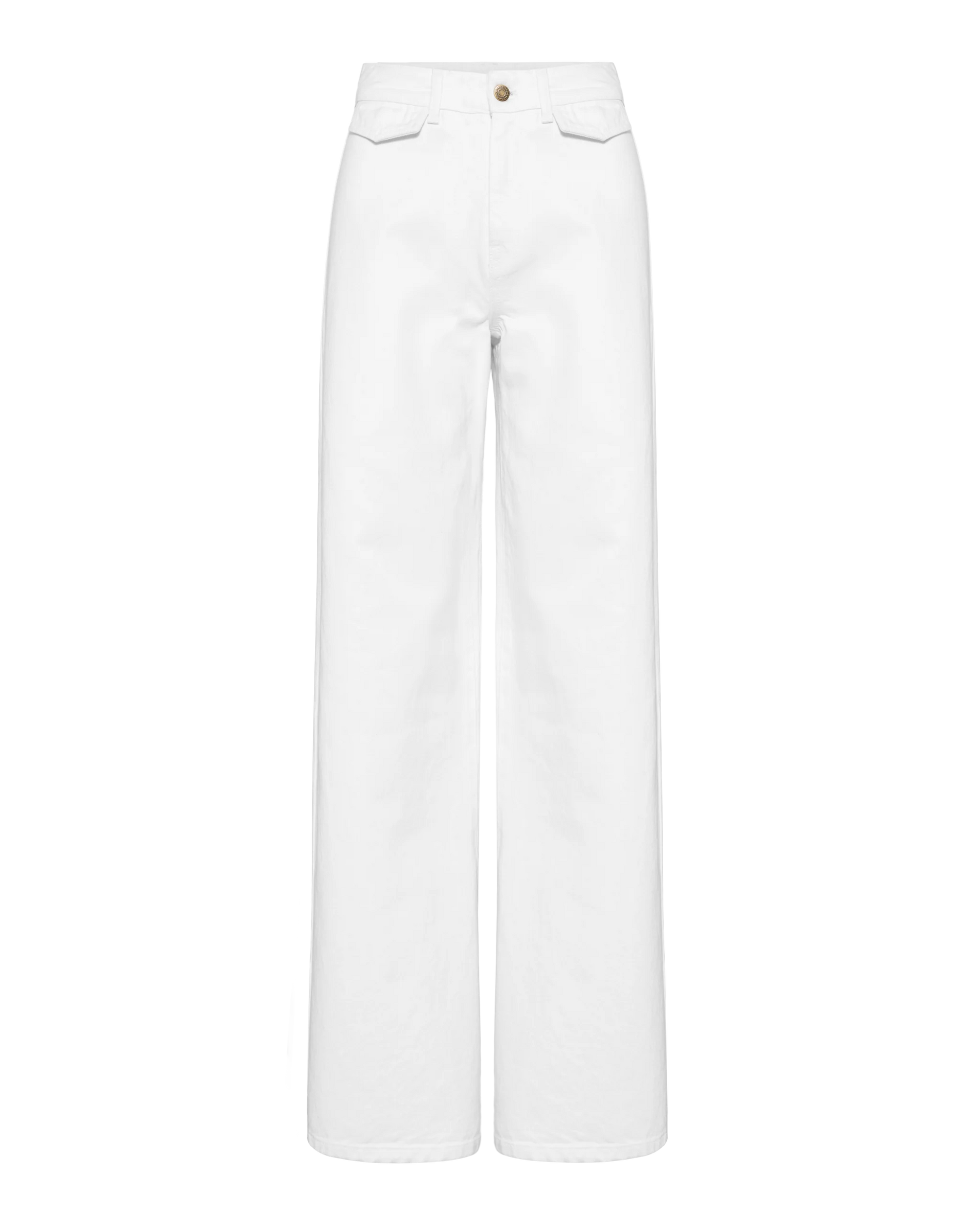 Nicole Jeans White. Hvite jeans fra Pia Tjelta med høyt liv i egyptisk bomull, designet med vide ben og en lang, flatterende silhuett. Ren passform over hoftene og strukturert linning gir et moderne og elegant uttrykk. Pene klaffelommer foran og vanlige jeanslommer bak.Perfekt som baseplagg til både jobb og hverdagsbruk.