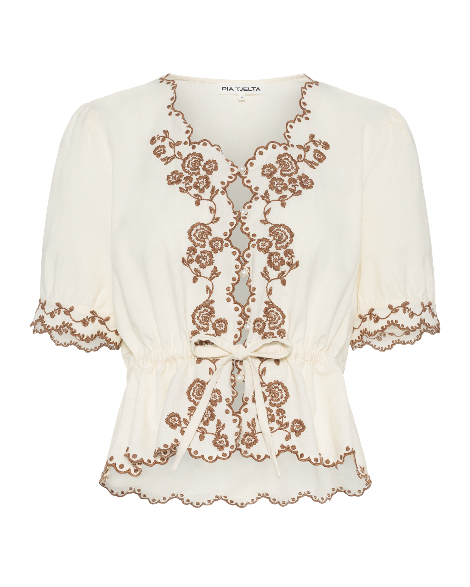 Hennie Blouse White/Clay. Bluse fra Pia Tjelta i en nydelig, tynn bomullskvalitet. Blusen har en flatterende peplum-silhuett med justerbare midjebånd og korte ermer, som gir et uanstrengt, men sofistikert utseende. Delikat kontrastbroderi i brunt pryder knappestolpen og mansjettene, mens en engelsk blondekant gir et romantisk preg.