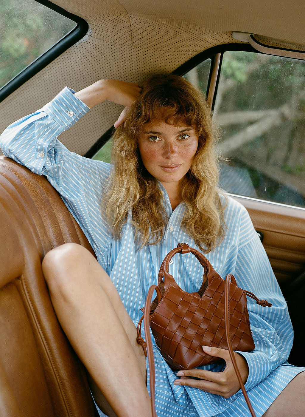 Denne håndflettede, lyseblå vesken vil løfte ethvert sommerantrekk. Den rommer de små tingene du trenger på en spasertur, og med skulderremmen kan du velge å bære henne tett inntil kroppen.