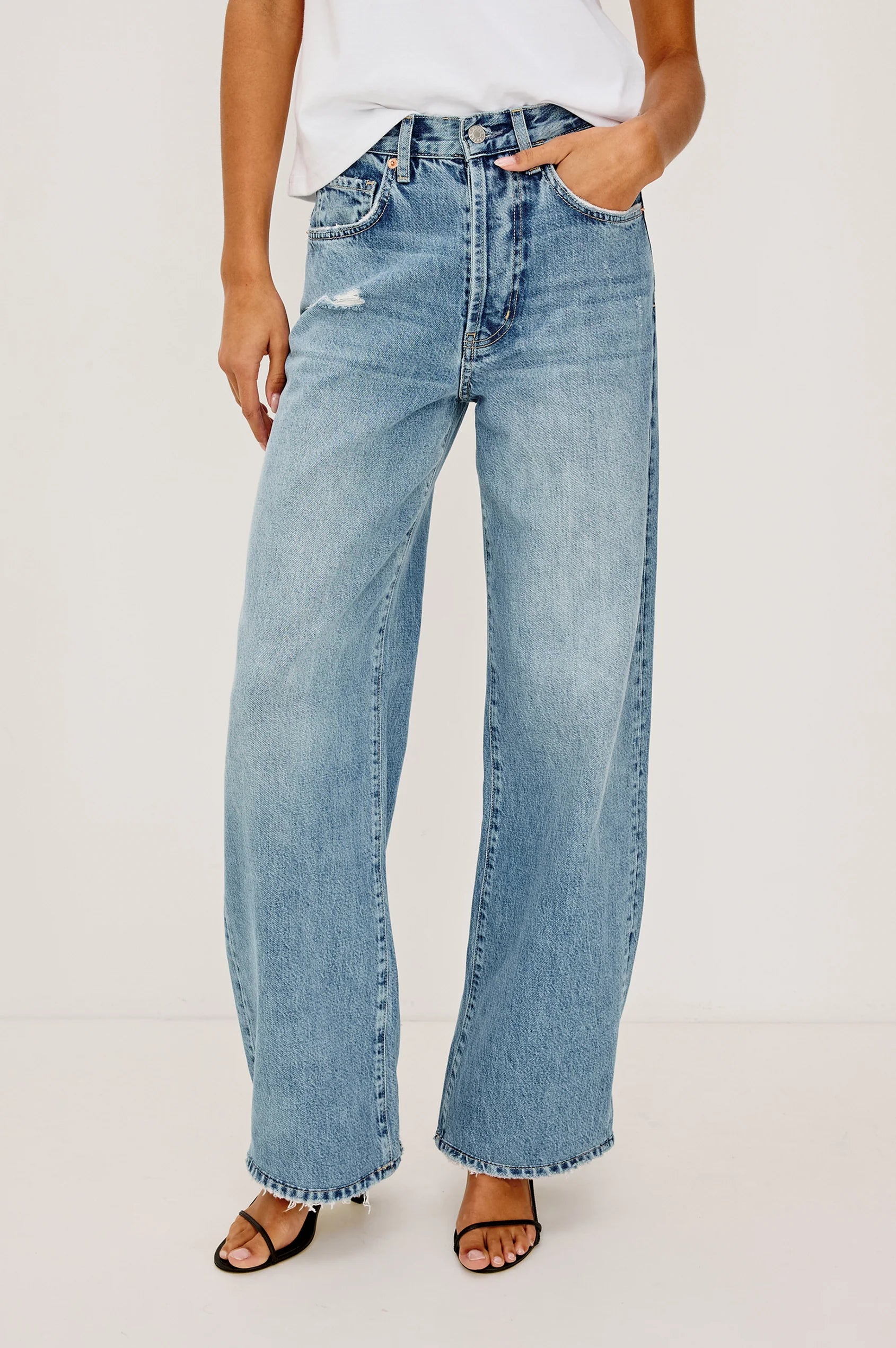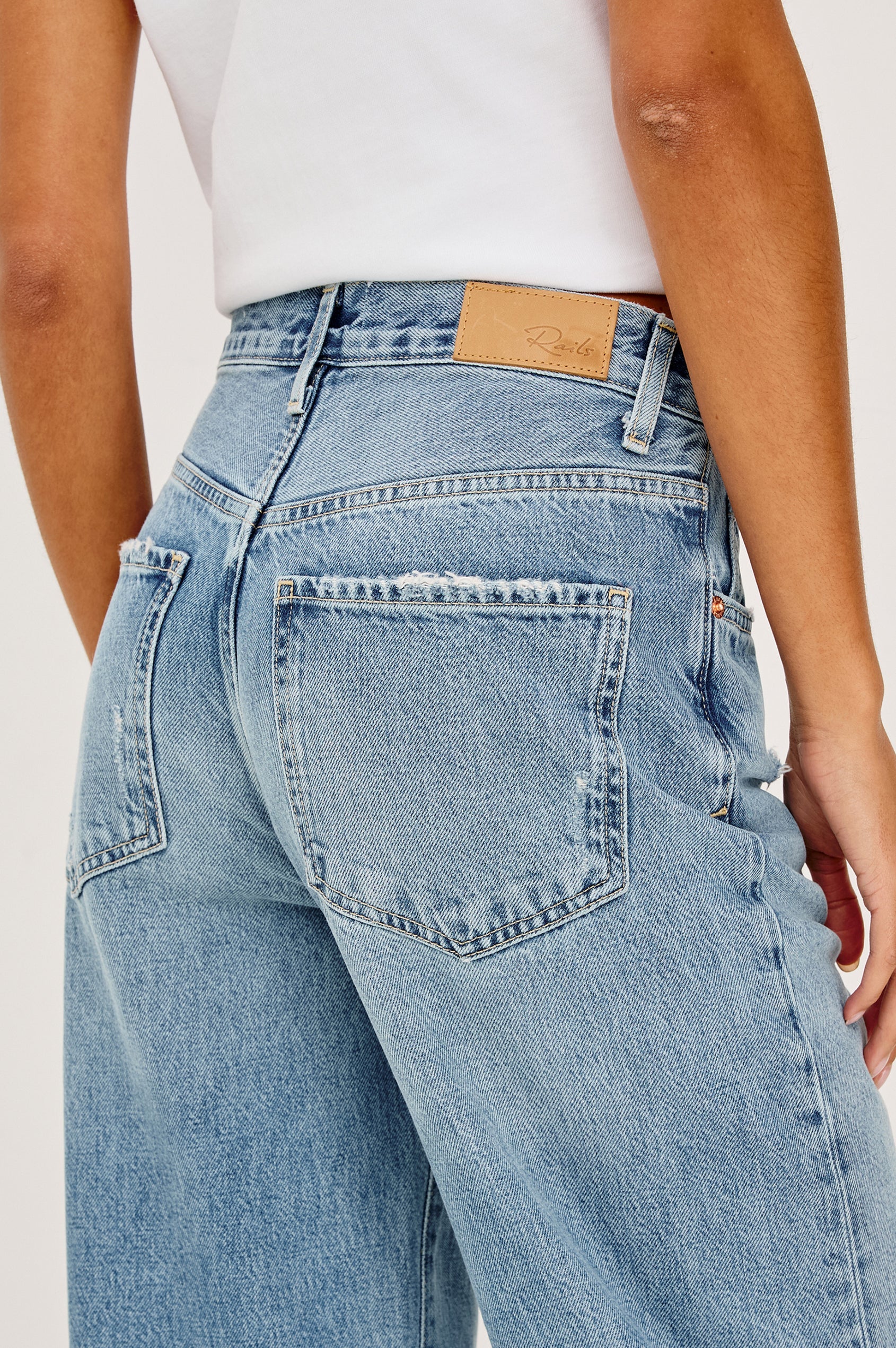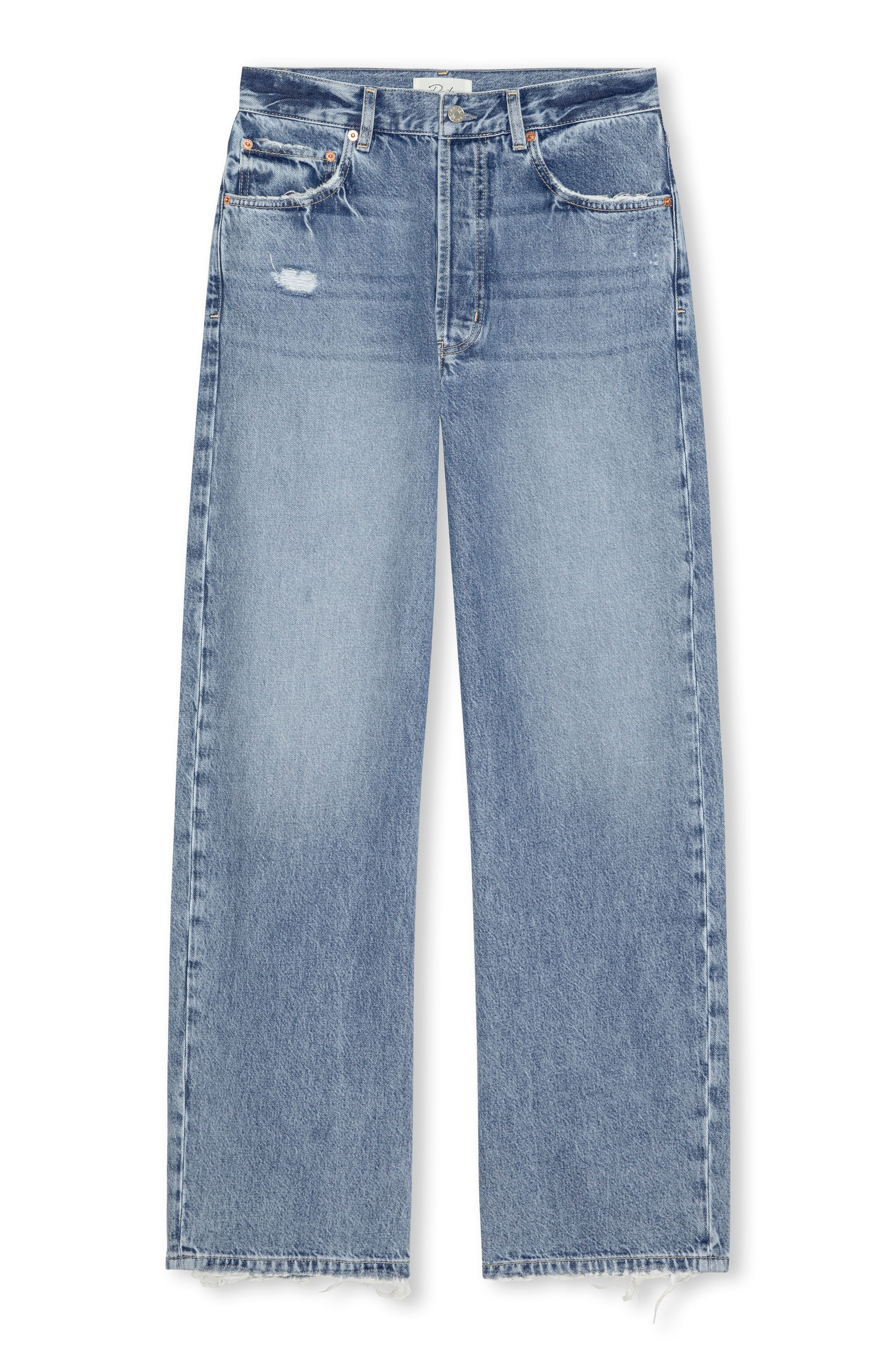 Belmont Autentic Stone. Belmont er en highwaist, blå jeans fra Rails med en moderne, lett buet benfasong som gir en flatterende og forlengende silhuett. Modellen har en avslappet passform over hoften, knappelukking i front og lengre benlengde som gir et elegant fall. Den karakteristiske fasongen er en videreutvikling av den populære barrel-jeansen og kan enkelt styles.